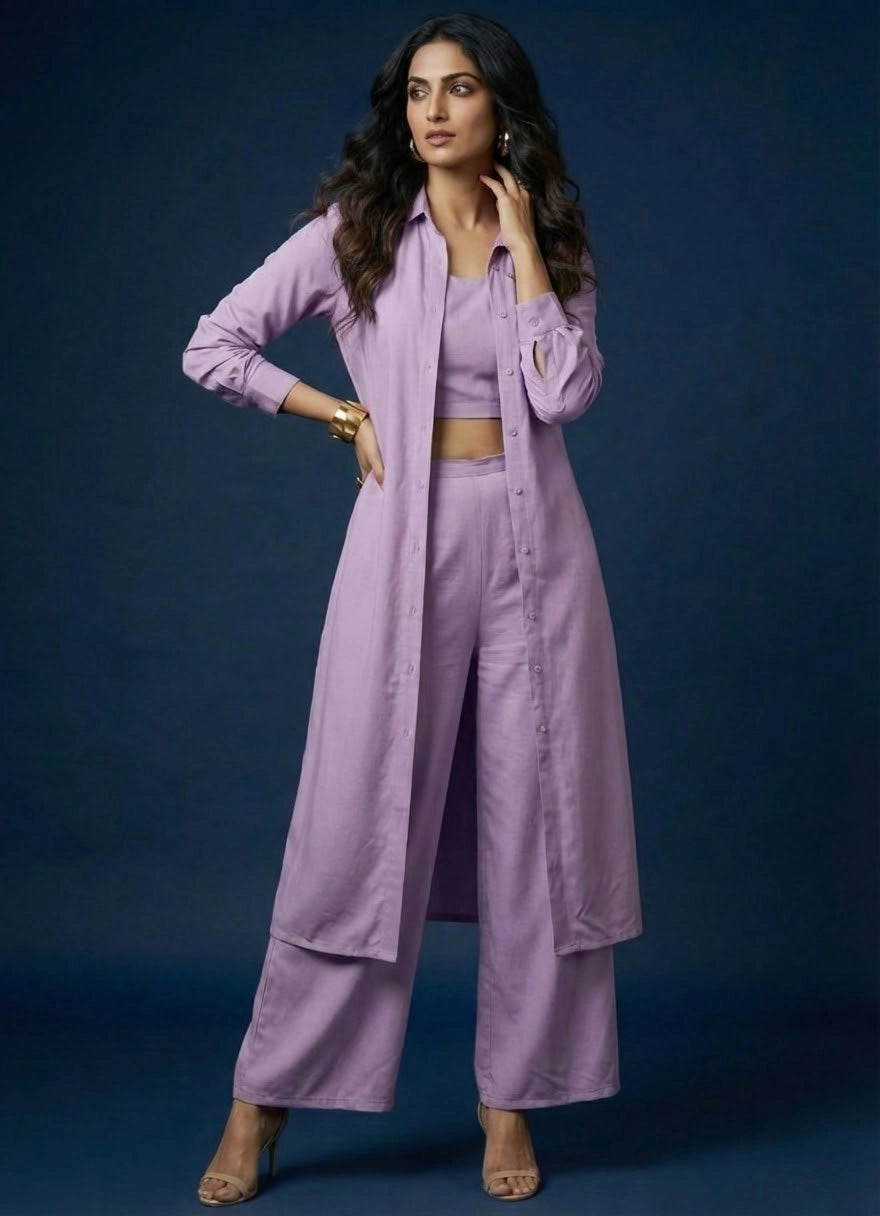 Elevate your wardrobe with this sophisticated lavender three-piece co-ord set, perfect for both occasional and regular...