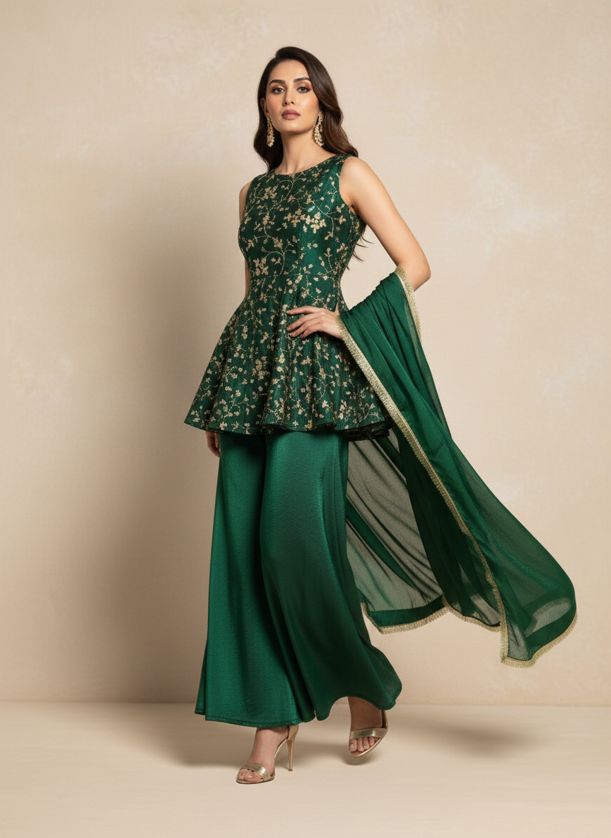 This elegant emerald green set features a sleek plain top with a flattering V-neck. Designed...
