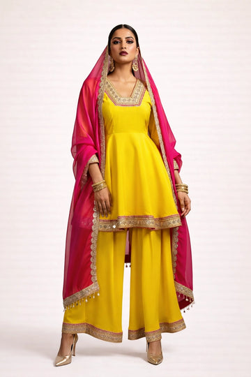 This sky blue short kurti and palazzo set offers a clean and elegant silhouette. The...