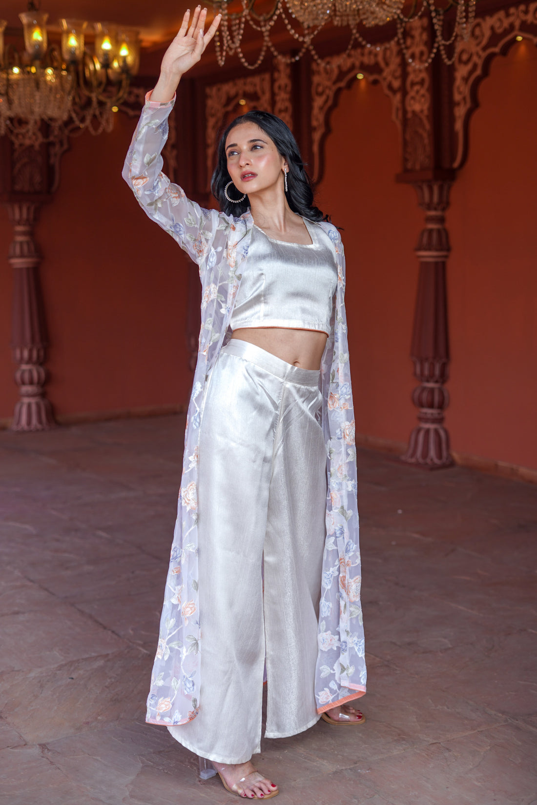 Elevate your style with this stunning pearl blue crop top and jacket set! The top...