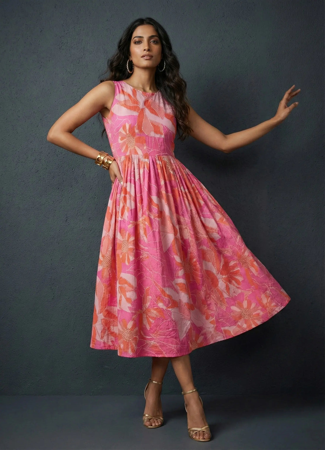 Pink Blue Multi-coloured Floral Printed Dress- 52384D