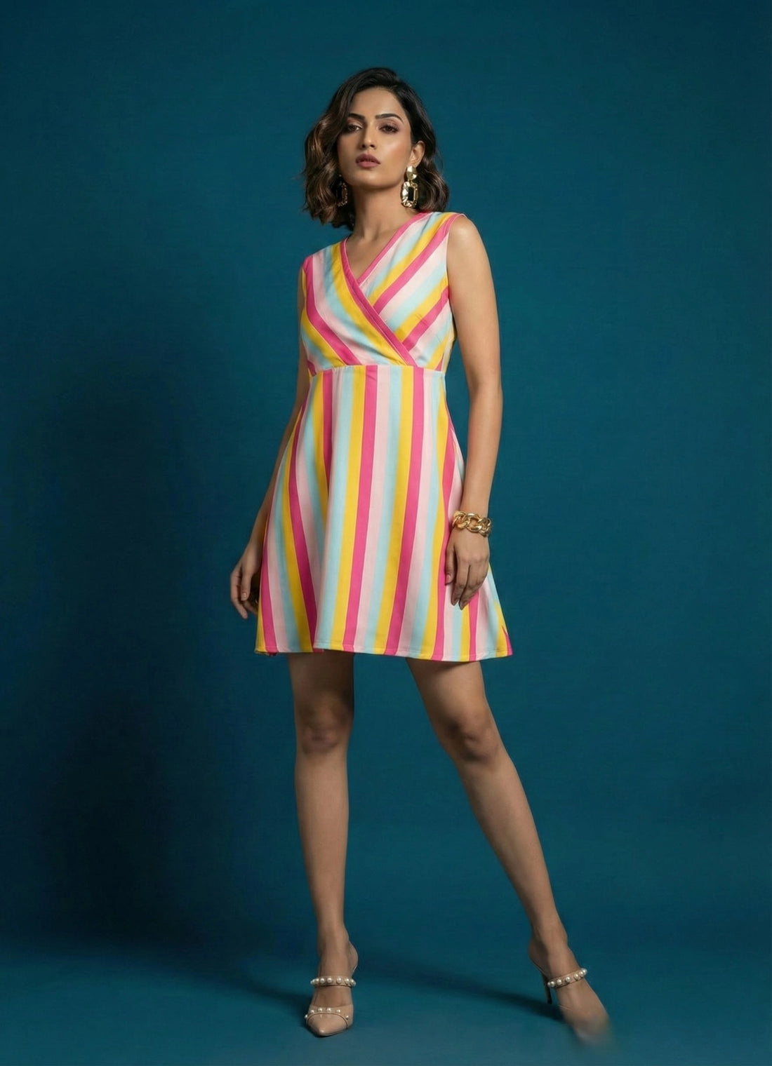This stylish powder pink dress features a sleeveless design with an elegant overlap collar neck...