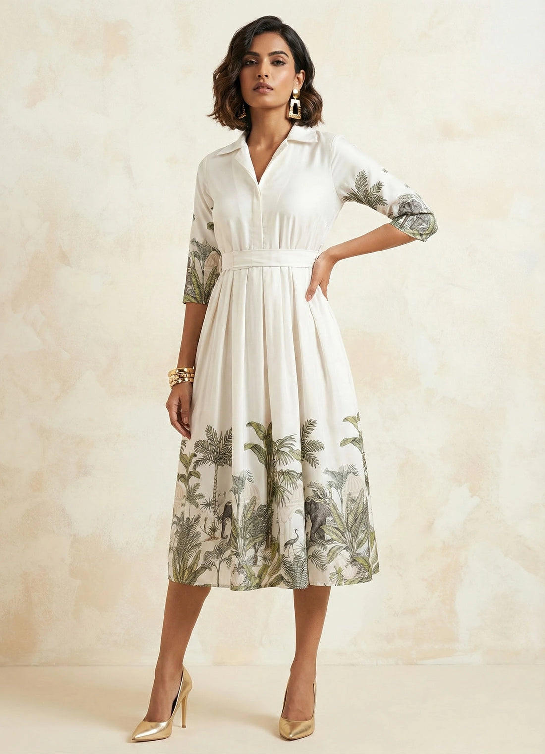 This elegant pearl white dress features ¾ plain sleeves and a classic collar neck, adorned...