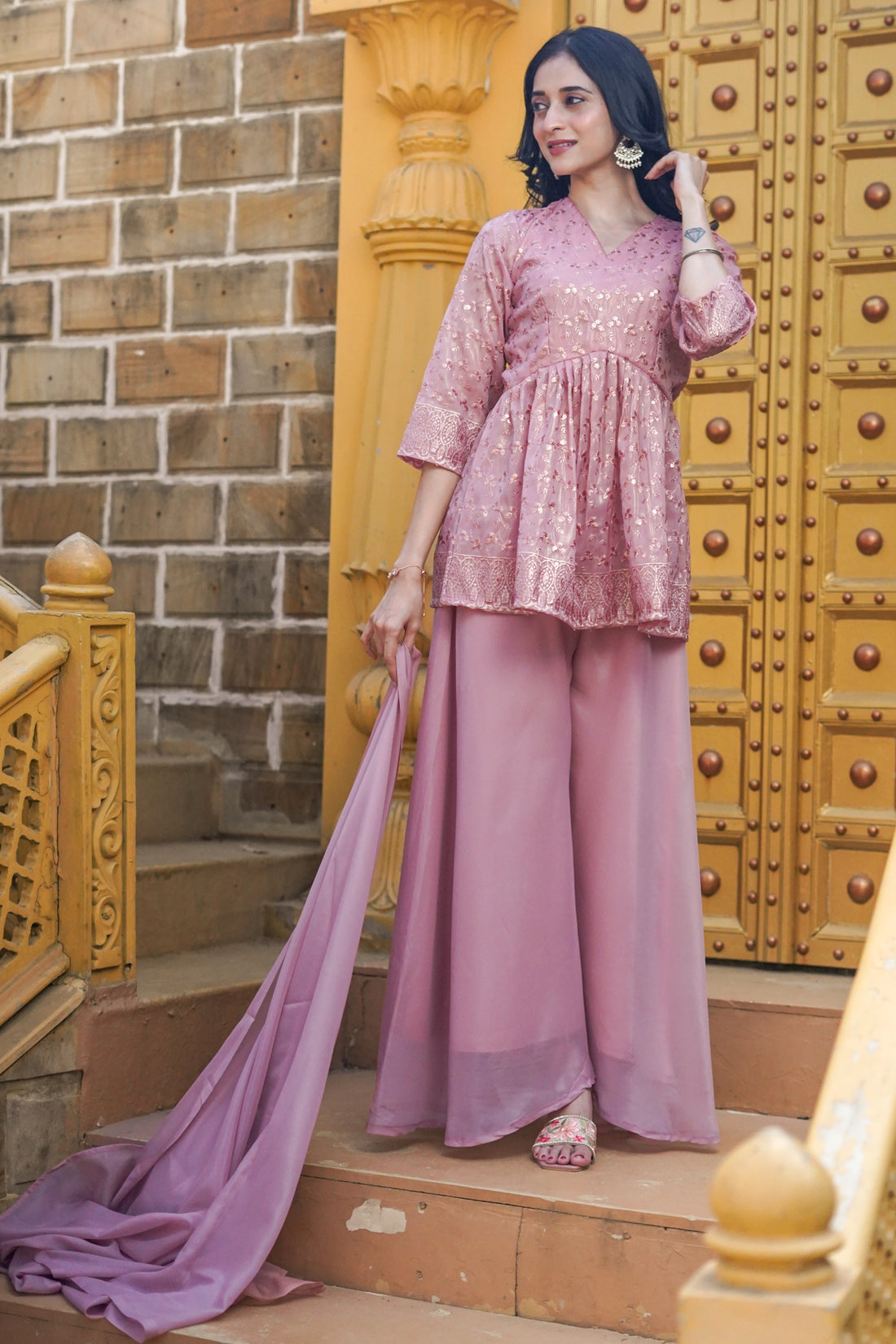 Quartz Pink Embroidered Paplum & Palazzo- 52470A