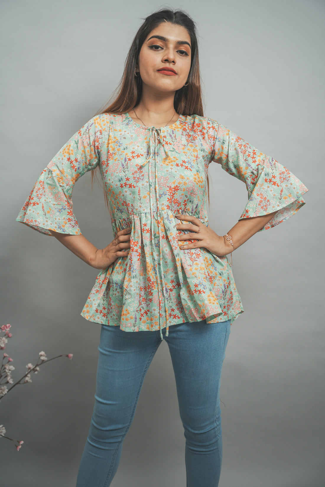 Light Green Multi-coloured Floral Printed Muslin Top -52424T