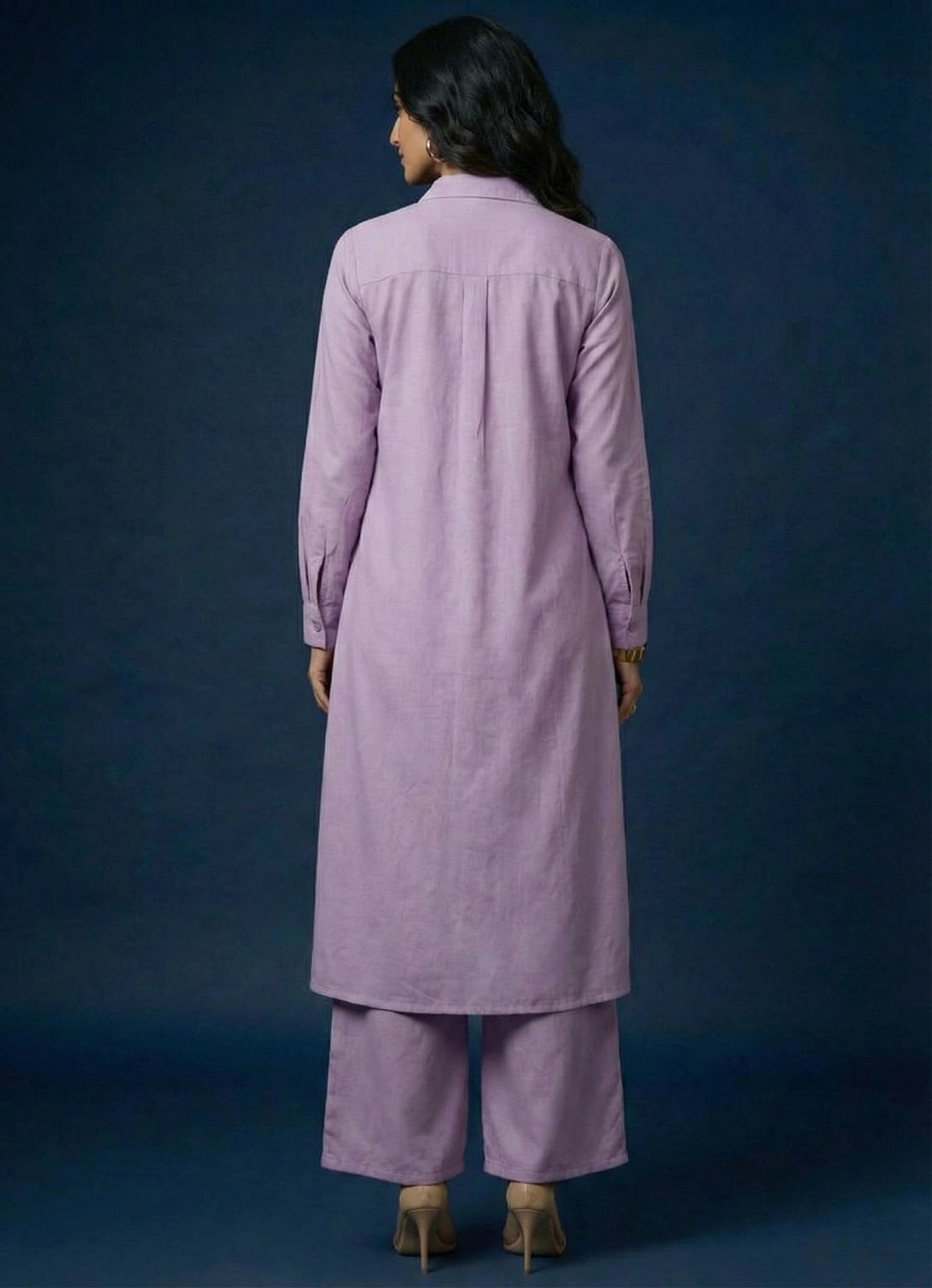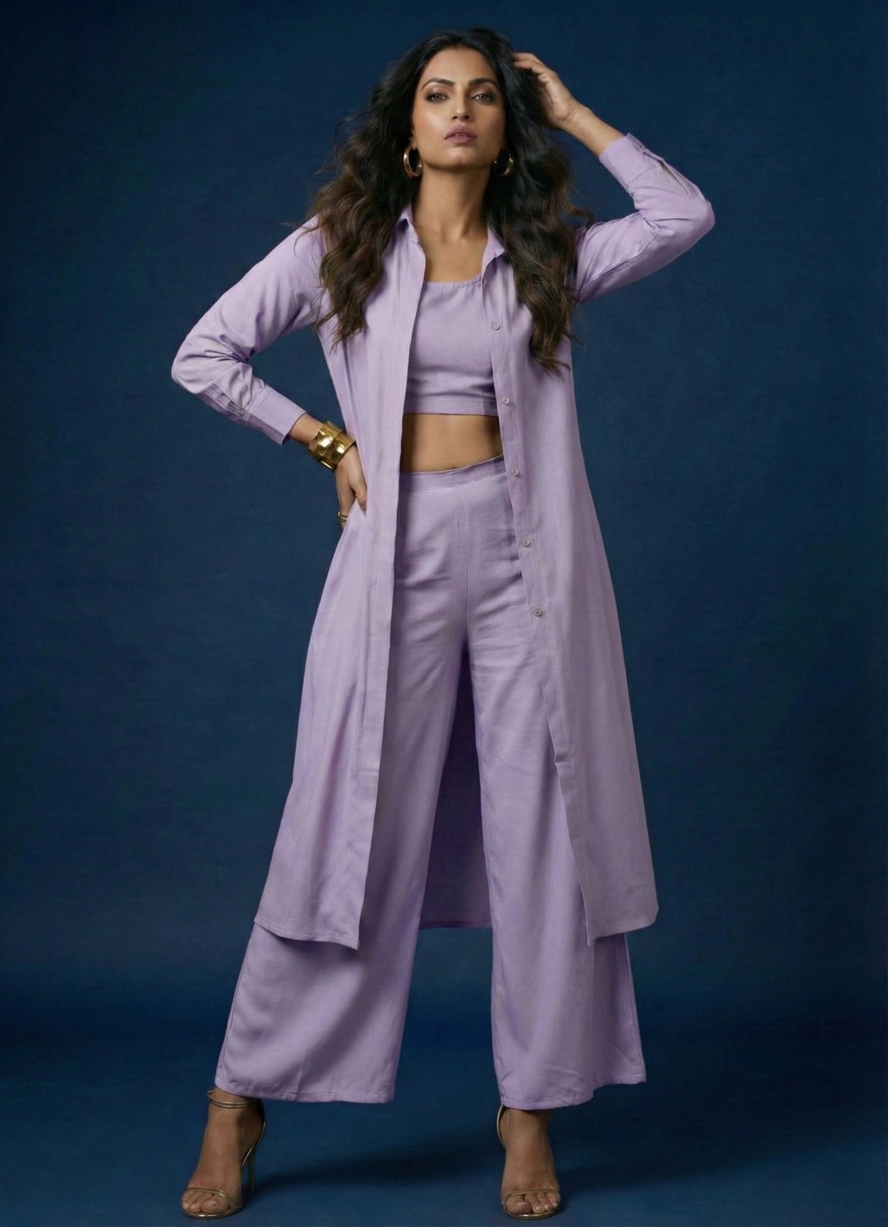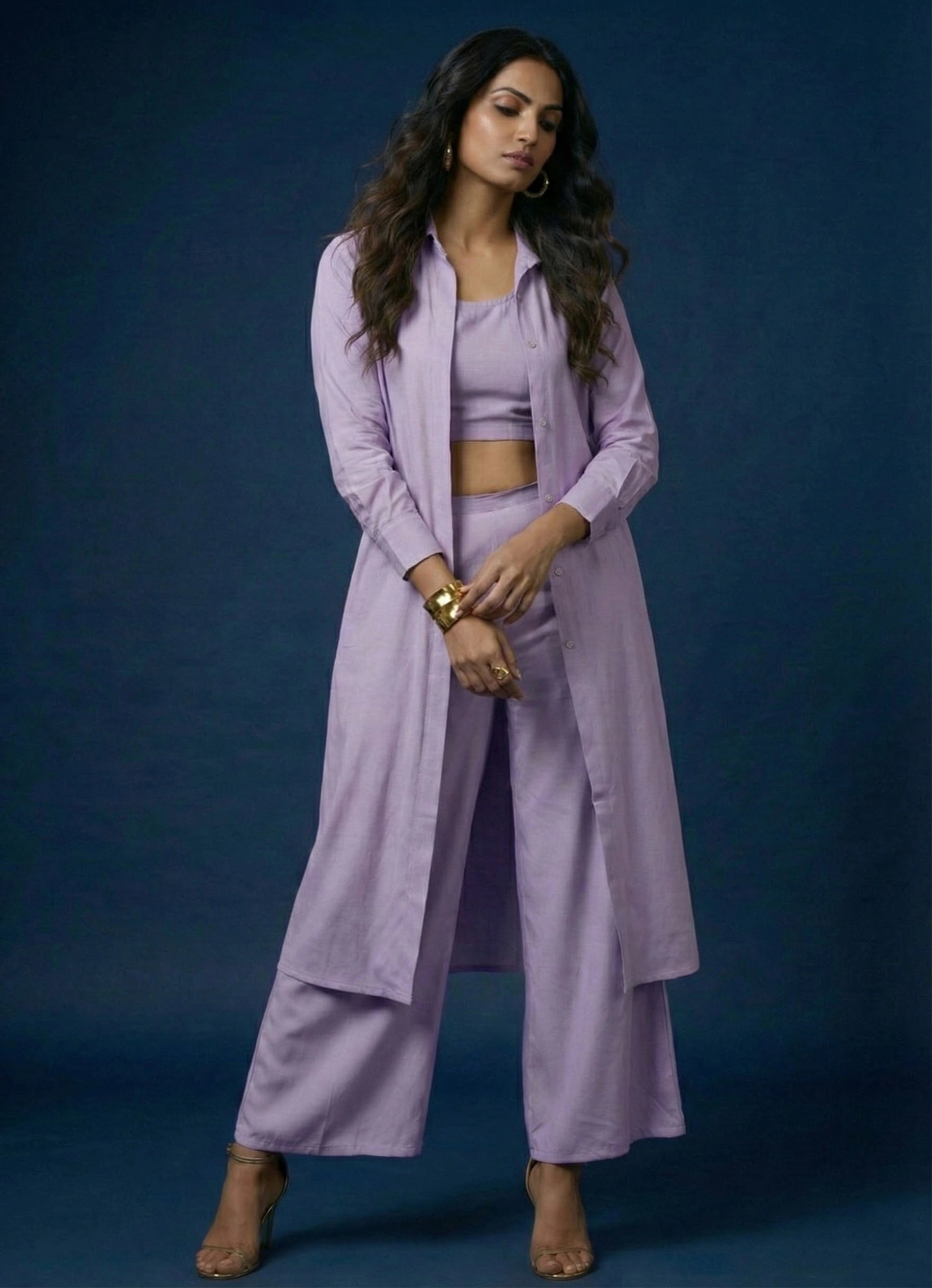 Elevate your wardrobe with this sophisticated lavender three-piece co-ord set, perfect for both occasional and regular wear. The ensemble features a hip-length long shirt top with a classic collar neck and full sleeves, offering a sleek and modest silhouette. The plain Cotton blend fabric enhances its refined appeal, while a matching round neck inner in a similar olive green shade adds comfort and depth. Complementing the top is a pair of full-length palazzo pants in the same hue, designed with a half belt and half elastic waistband for effortless wearability. This no-print set delivers a timeless and elegant look with modern ease.