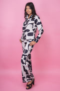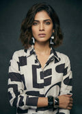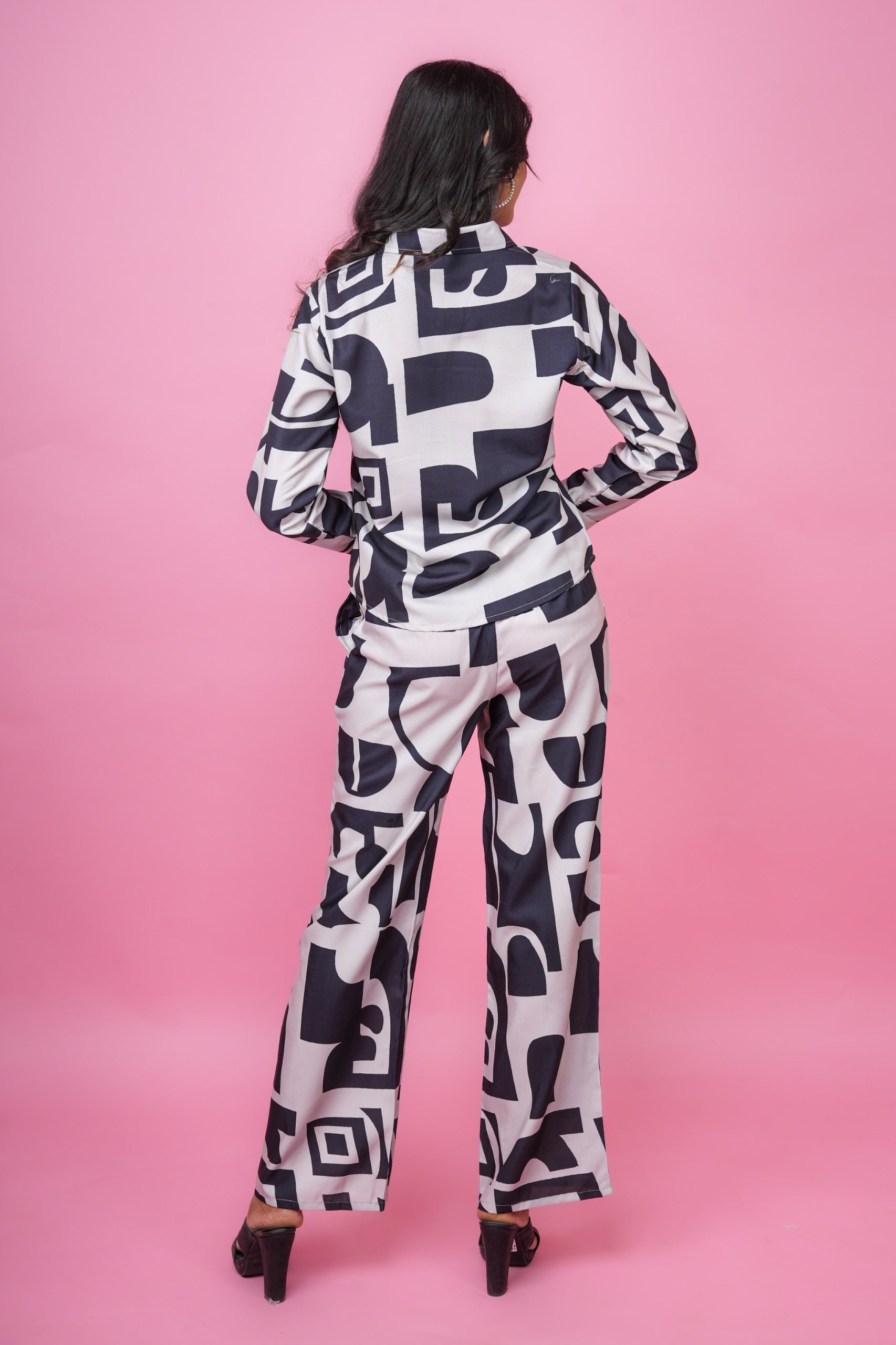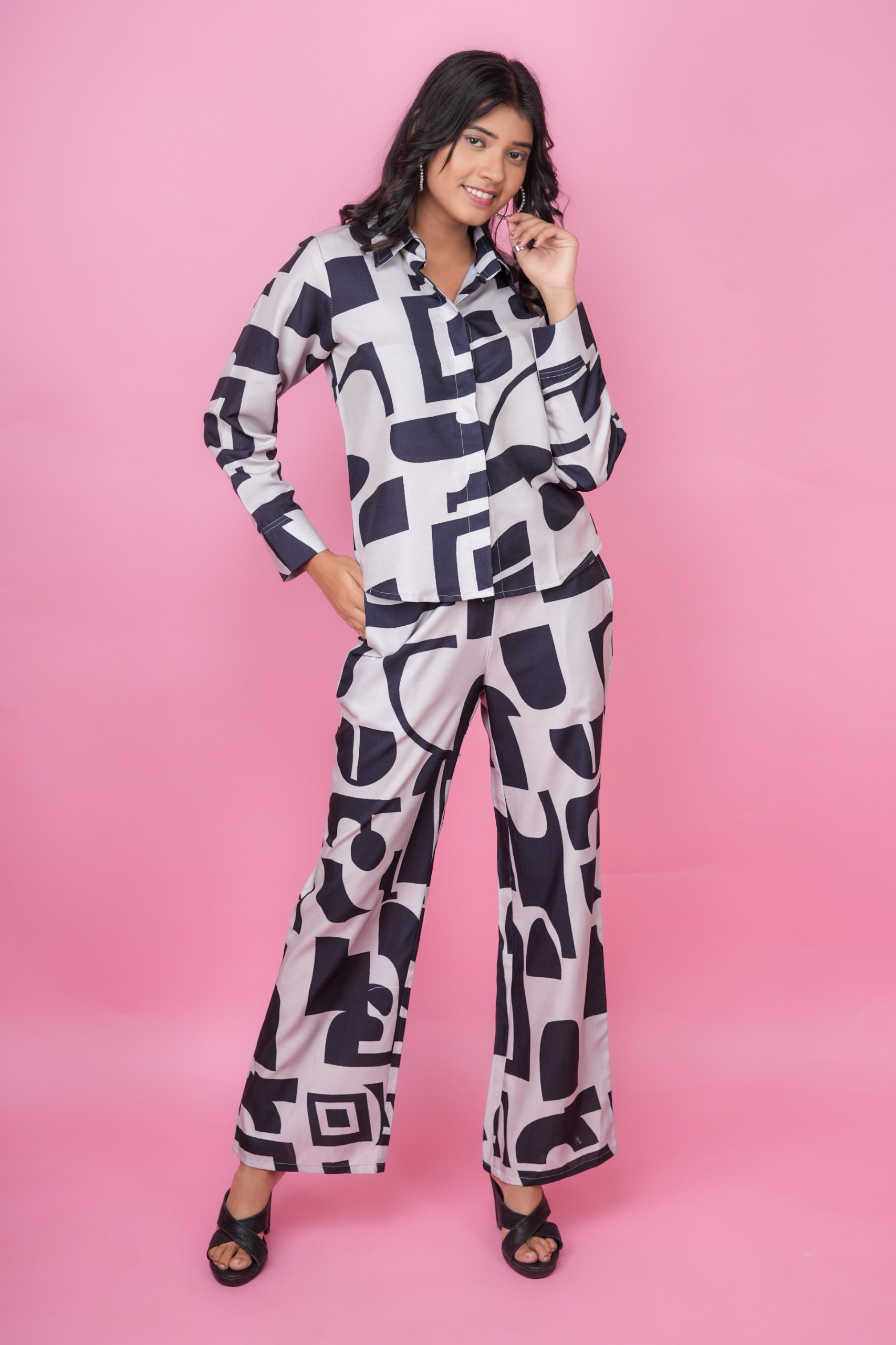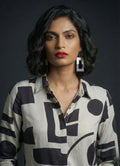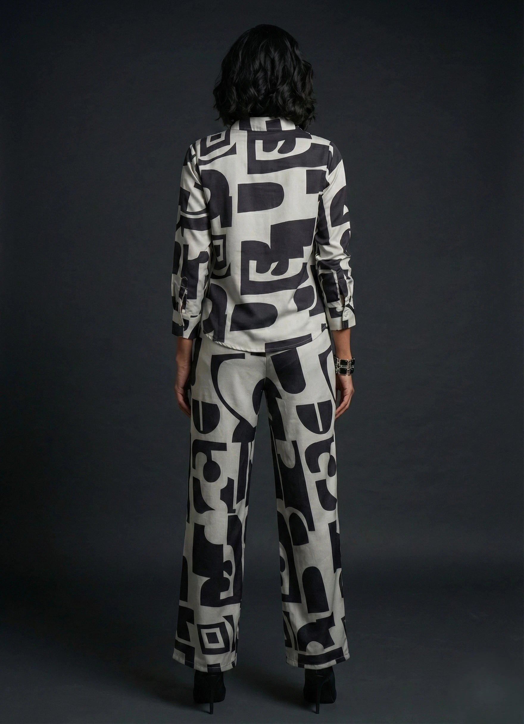 This elegant beige co-ord set is designed for both office and occasional wear, offering a chic and comfortable look. The waist-length top features full cuffed sleeves and a flattering V-neck, adorned with a stylish abstract print that adds a modern edge. The matching beige bottoms, also featuring the same abstract print, come with a half-belt, half-elastic waistband for a perfect fit. This set effortlessly combines contemporary style with sophistication, making it a versatile addition to your wardrobe.