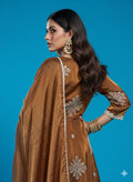 Radiate charm in this antique gold Angrakha-style Anarkali. Features a flattering V neck with ¾ sleeves. Adorned with elegant motif embroidery and lace accents. Crafted in rich embroidered Fandy Organza fabric. Paired with a plain narrow pant for a sleek finish.