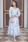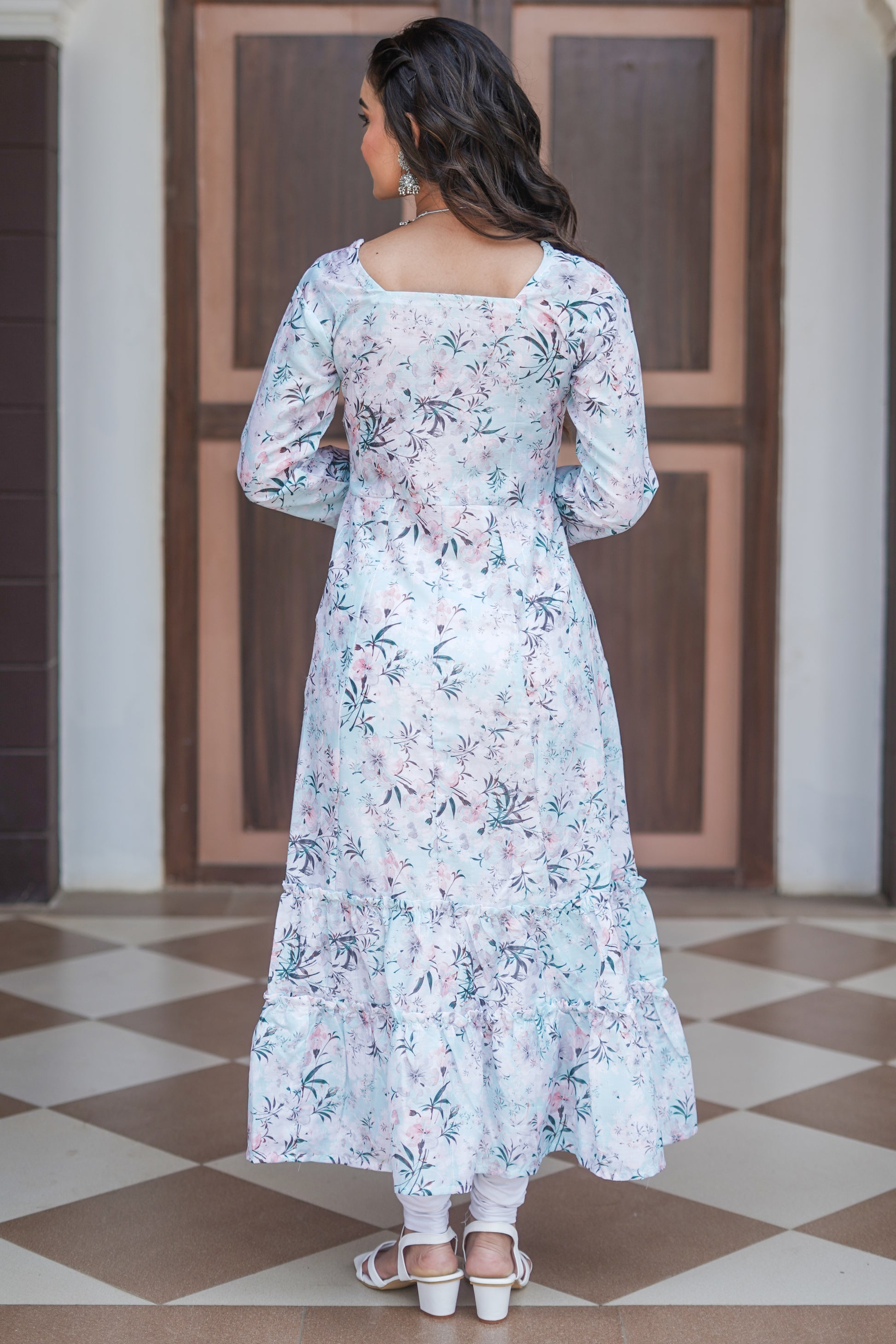 Be a picture of grace and beauty in this aqua green coloured floral printed kurta designed out from floral printed Cotton Blend kurta. This kurta consists of a square neckline, A-line kali pattern with frills at hemline and regular patterned three-fourth sleeves.