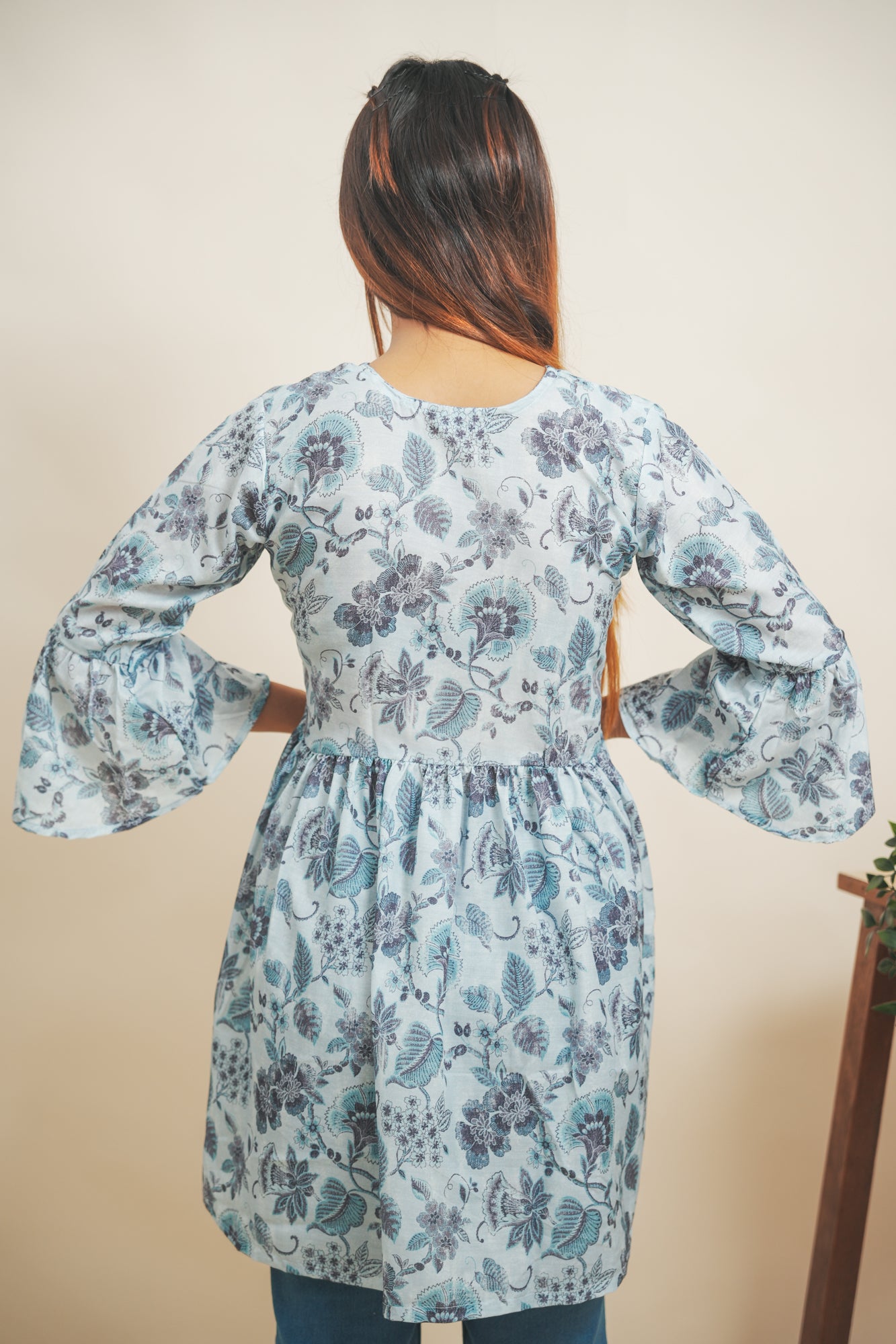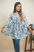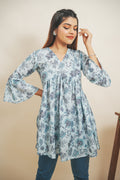 Channel your inner diva with this stunning floral printed top, a wardrobe must-have. Crafted from Cotton Blend fabric, it features three-fourth sleeves with the pattern of gathered bell bottom, styling at the yoke and V neckline. It is a above knee length top.