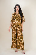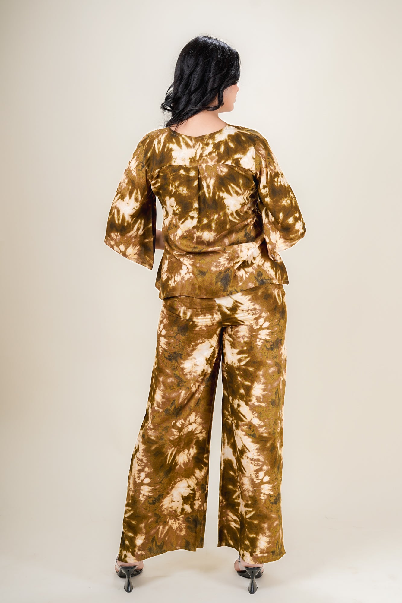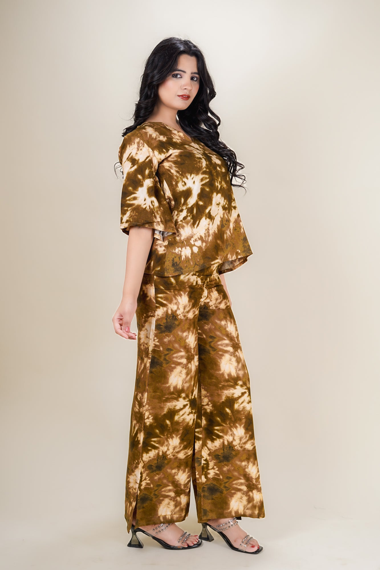 Elevate your everyday style with this chic army green co-ord set, featuring a V-neck hip-length top with elbow sleeves and an all-over tie & dye print. Crafted from soft Cotton blend, it pairs effortlessly with full-length palazzo pants for a relaxed yet polished look—ideal for both casual and occasional wear.