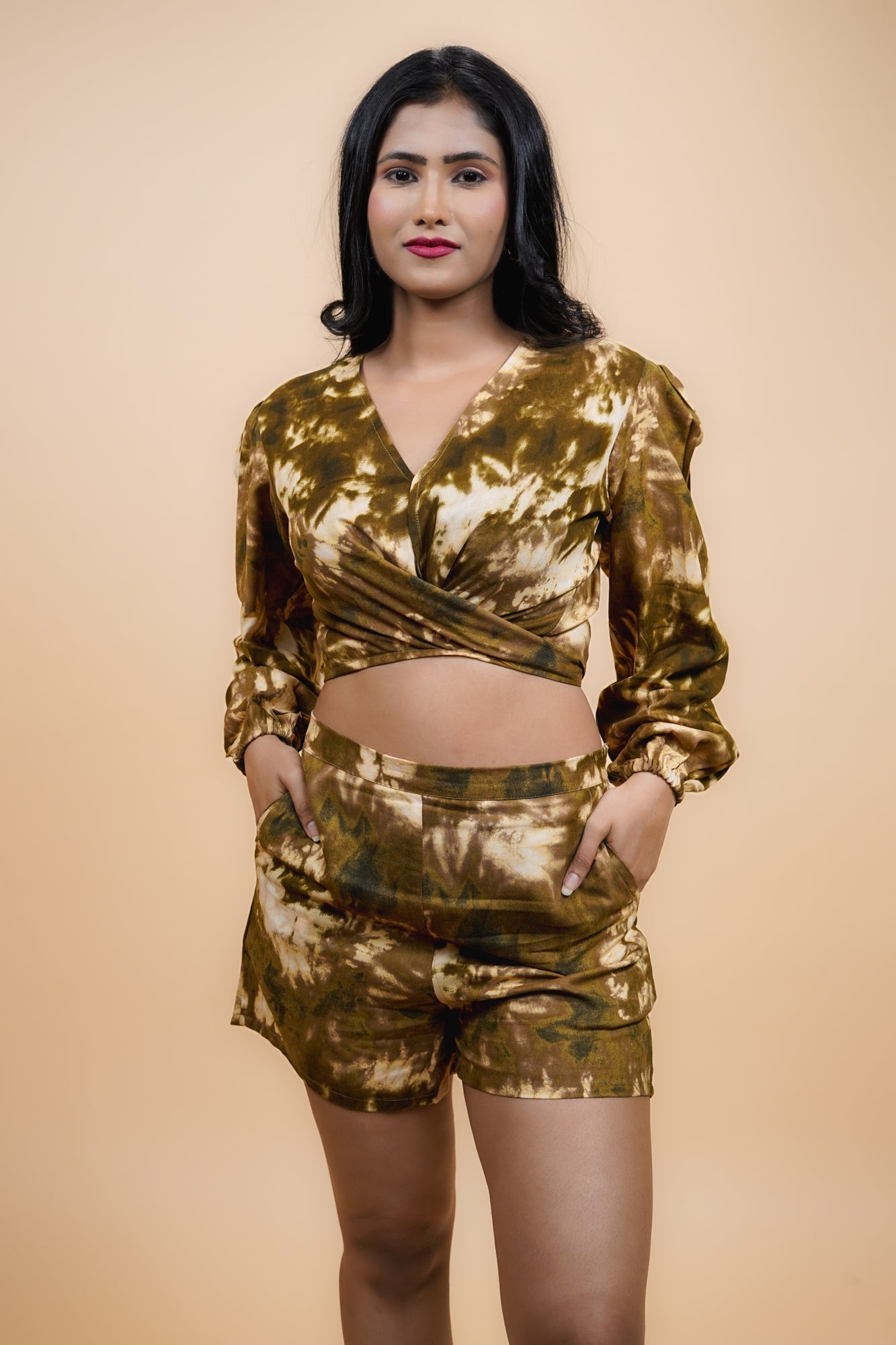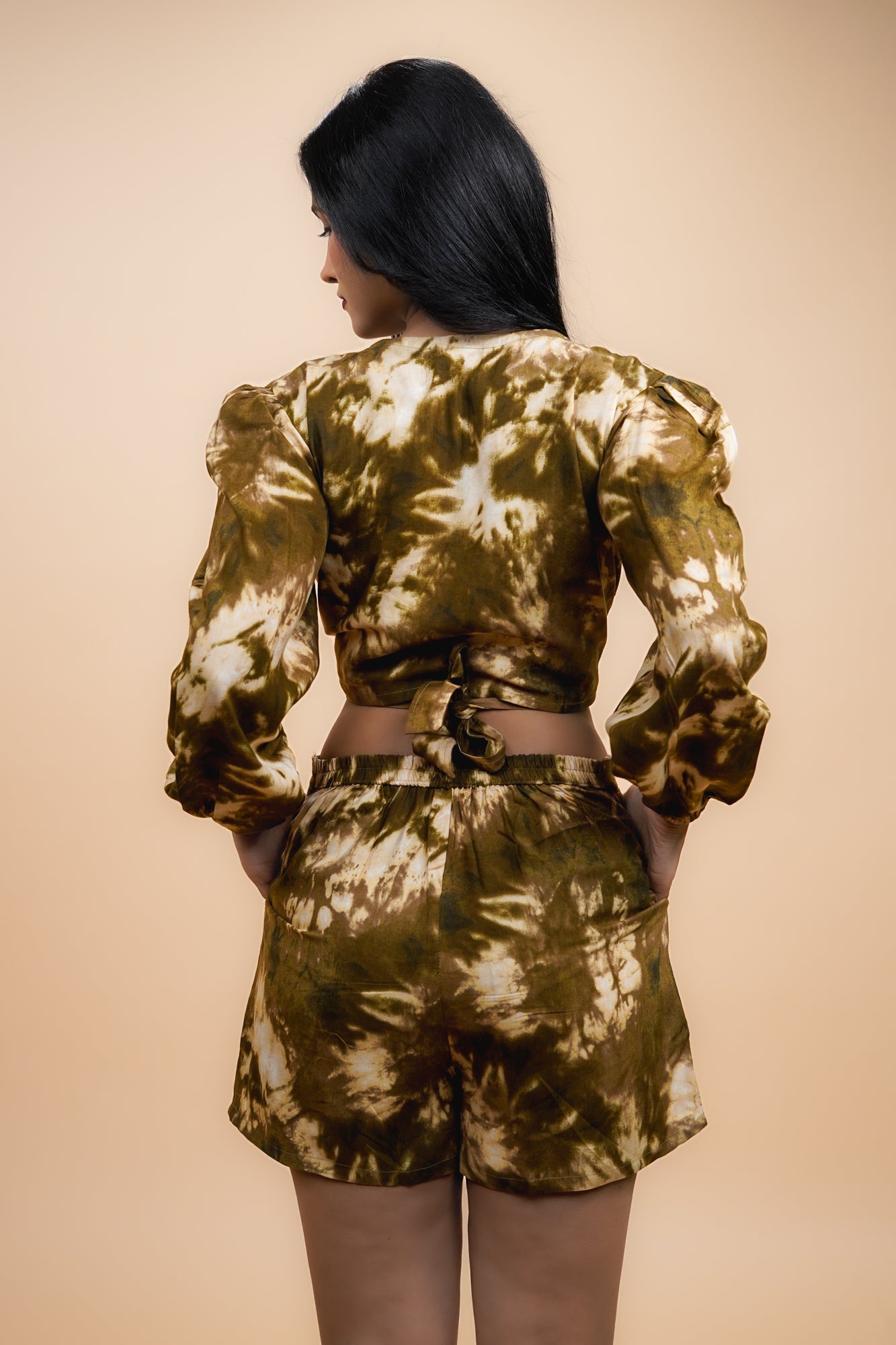 Stay effortlessly stylish in this army green tie & dye co-ord set, featuring a mini-length crop top with full sleeves, a flattering V-neckline, and a trendy front tie-knot detail. Paired with above-knee length palazzo pants, this set is perfect for casual days or laid-back occasions with a touch of flair.
