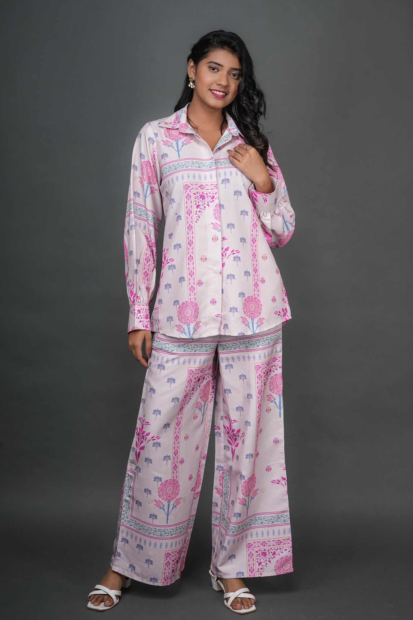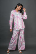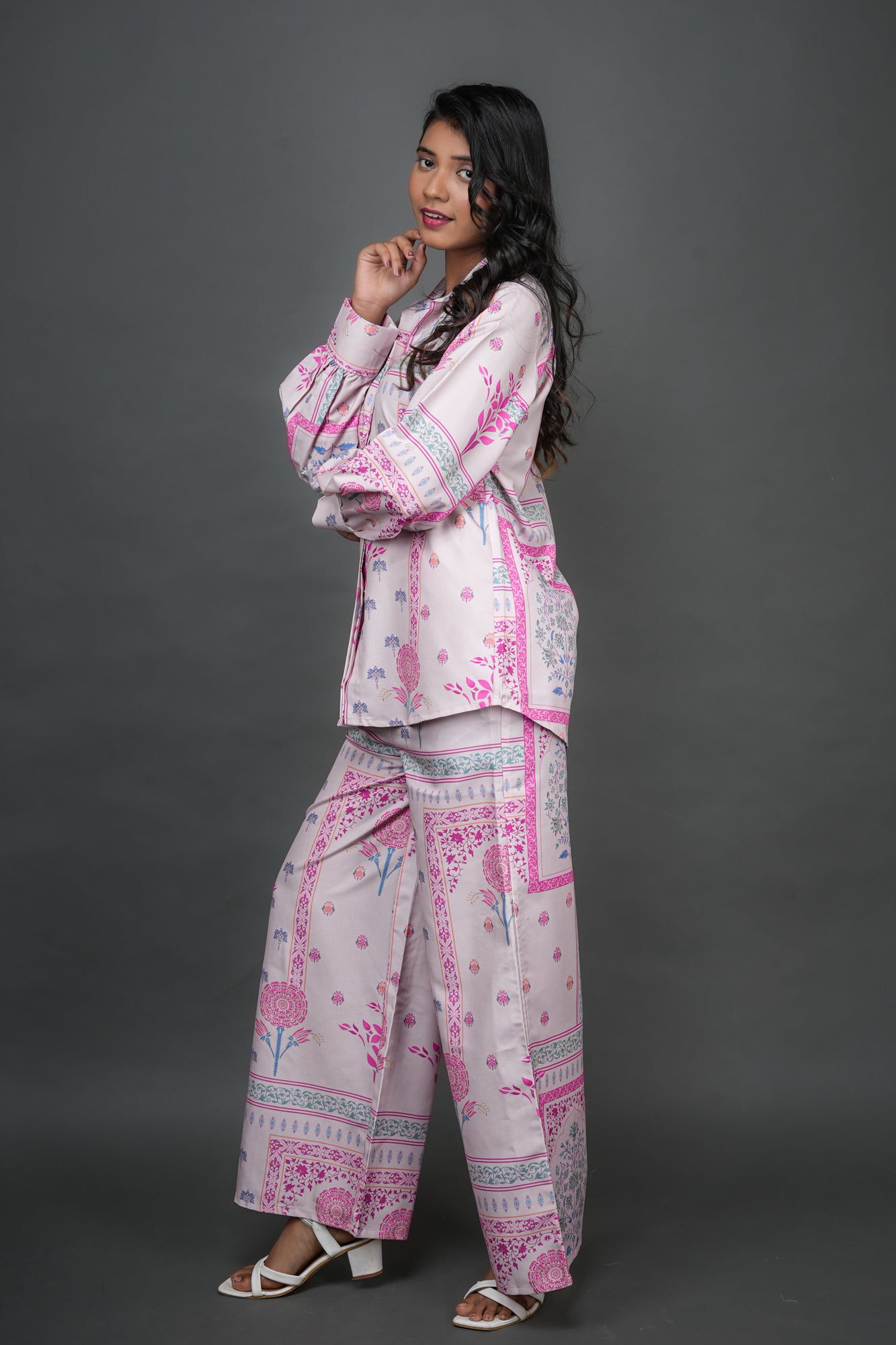 The matching baby pink palazzo pants, featuring the same geometric floral print, are designed with a half-belt, half-elastic waistband for a comfortable and flattering fit. Crafted from cotton blend digital print, this set offers a chic, elegant look for any occasion.