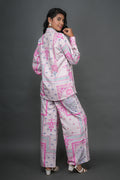 This stylish baby pink co-ord set is perfect for both office and occasional wear. The hip-length top features full cuffed sleeves, a classic collar neck, and a unique geometric print with floral accents, combining modern and feminine touches.