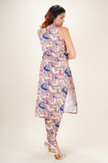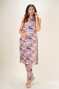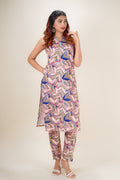 This elegant baby pink set features a knee-length sleeveless kurti with a flattering V-neck, adorned with delicate leaf prints. Crafted from soft rayon fabric, it ensures comfort with easy-care gentle machine wash. The kurti is paired with matching full-length narrow bottom pants, also printed with the same leaf pattern, and designed with a half-belt, half-elastic waistband for a perfect fit. Ideal for both occasional and regular wear, this ensemble blends style and ease effortlessly.