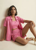 The coordinating Barbie pink bottoms sit just above the knee, designed with a half-belt, half-elastic waistband for a flattering and flexible fit. This set is a perfect blend of bold color and effortless style.