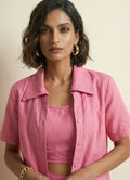 This vibrant Barbie pink co-ord set is perfect for both occasional and regular wear. The hip-length top features plain elbow sleeves, a simple round neck, and is made from soft, plain cotton blend for a comfortable and stylish fit.
