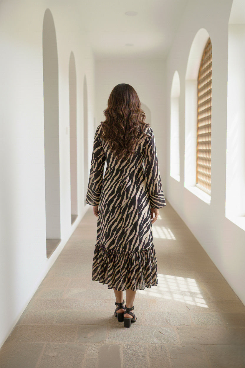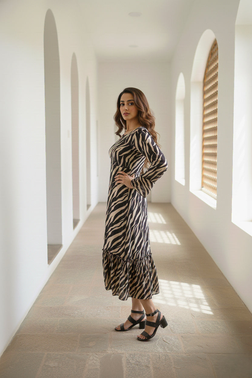 This zebra printed dress is the perfect combo of fierce and fashionable for women to make her stand out in crowd . Fashioned out from an animal printed cotton fabric consists of a round neck , frills at bottom of dress , full sleeves with a bell bottom pattern. It is a below knee length dress.
