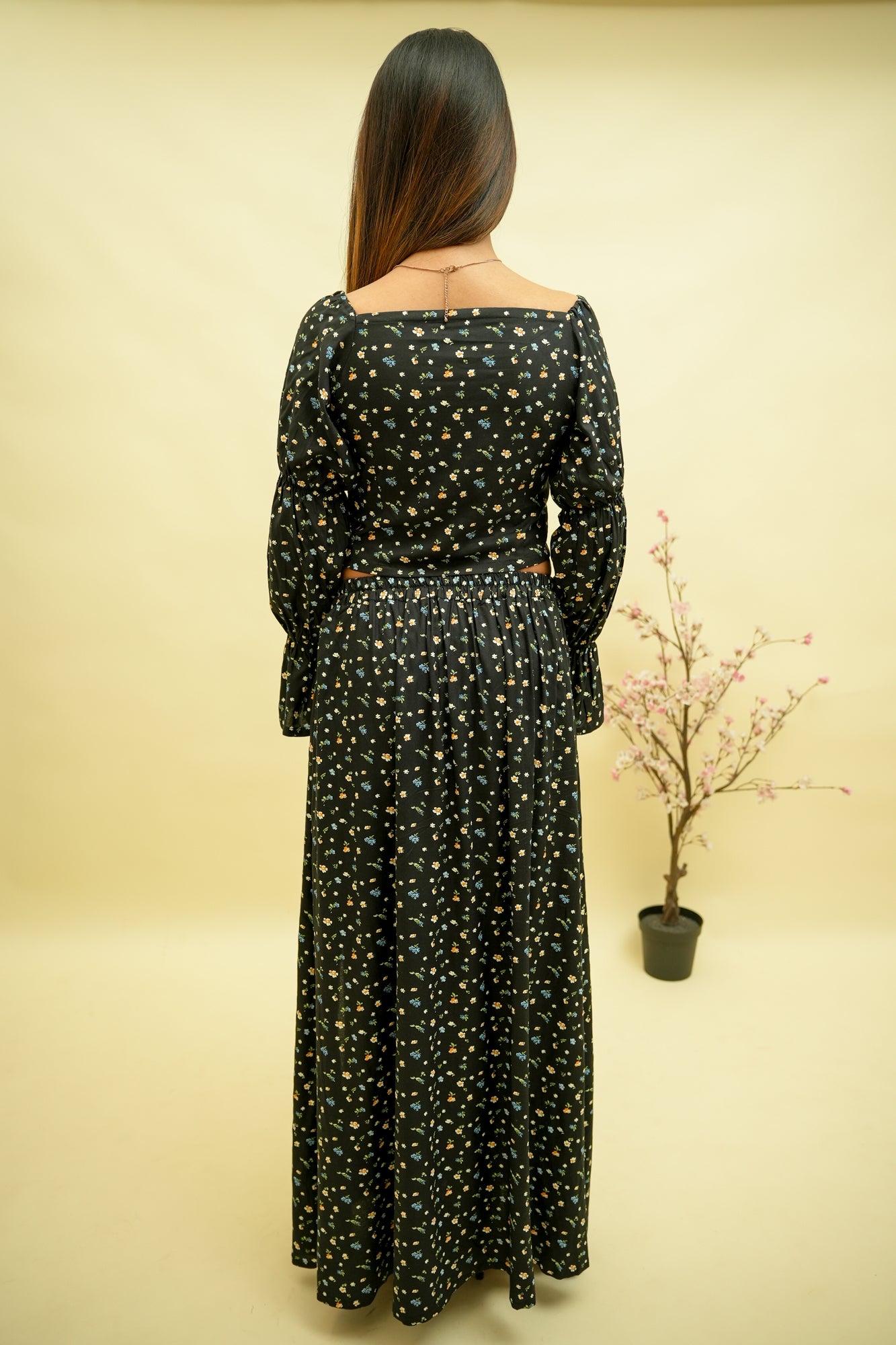 Description: A cute, comfy and trendy co-ord set crafted out from floral printed cotton fabric is amazing for a casual outing. It is a black skirt and crop top consisting of elastic on neck and in sleeve pattern paired with long skirt with a cut. You can wear this top as an off-shoulder top also.