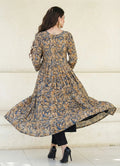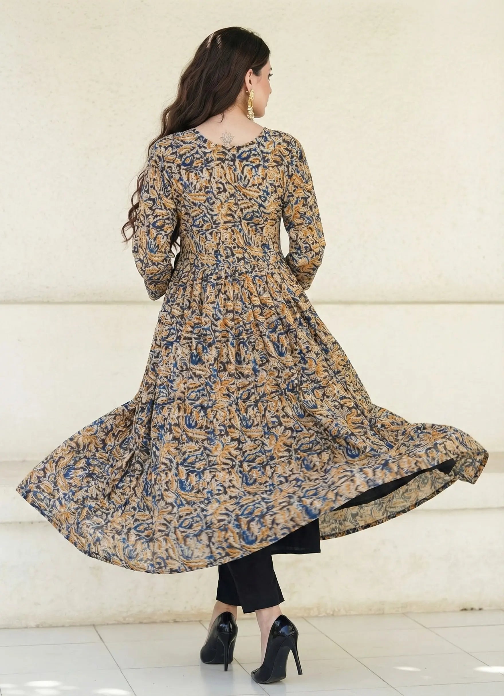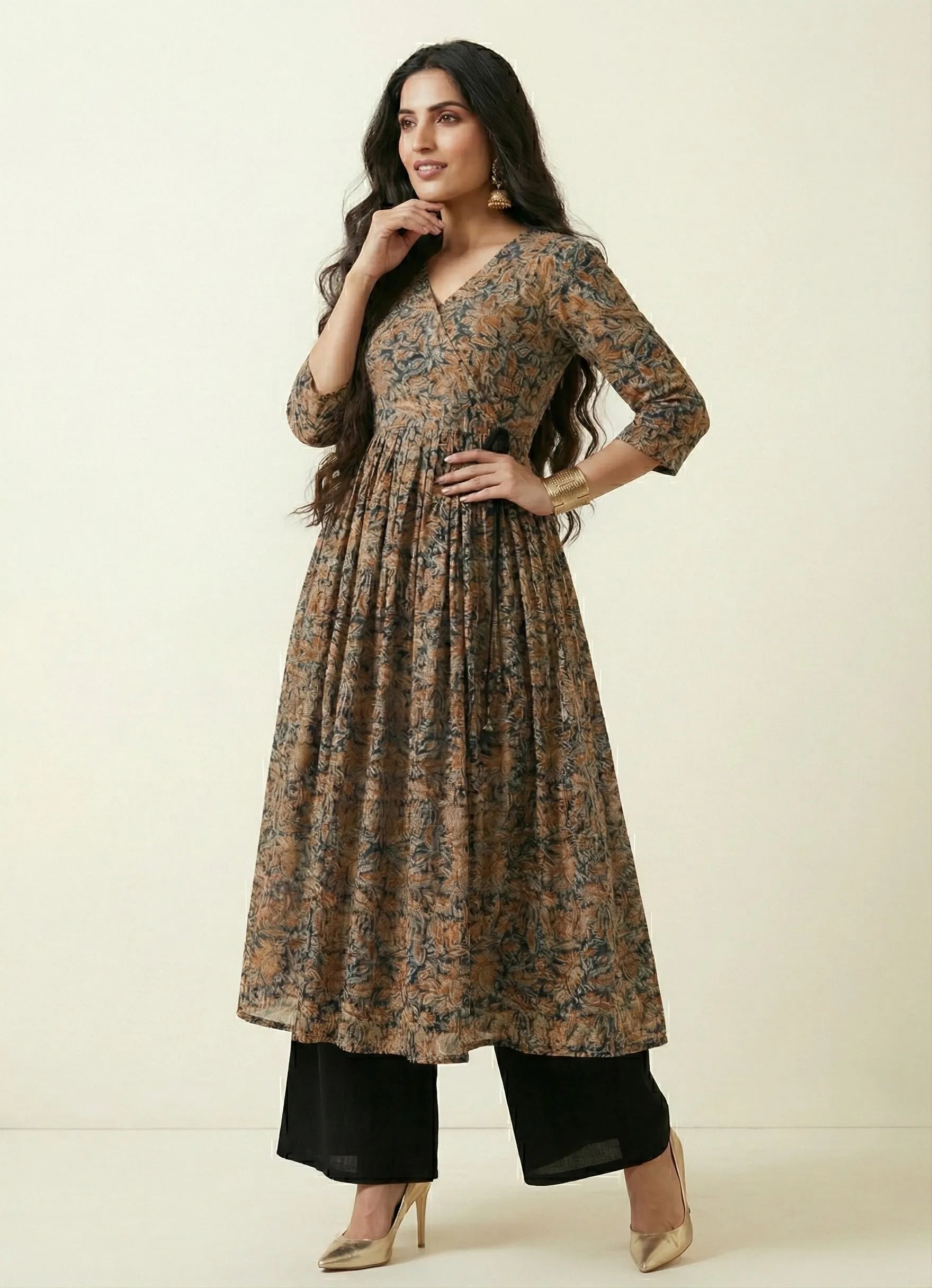 Introducing our Silhouette ensemble, featuring a stylish Anarkali paired with palazzo pants, designed for casual elegance. This ensemble comes in a timeless black hue with intricate Kalamkari print detailing, perfect for casual occasions. The Anarkali showcases 3/4th sleeves in a plain style and a flattering V-neck, offering a chic silhouette. Crafted from comfortable cotton fabric, it ensures breathability and ease of wear. The ensemble is completed with full-length palazzo pants, providing both comfort and style for your casual outings.