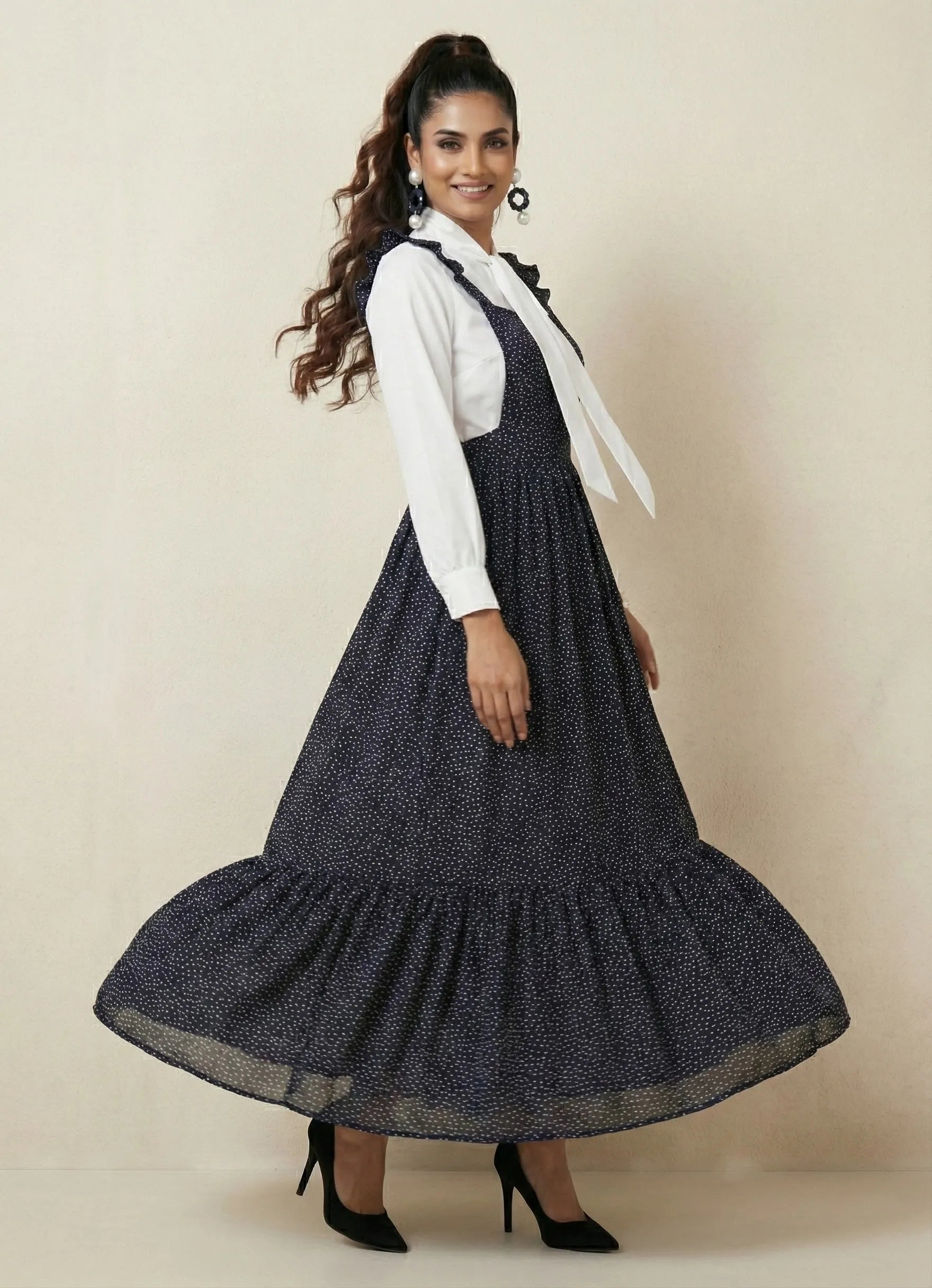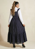 Make a playful statement with this black and white polka dot ensemble, featuring a full-length 1-piece dress paired with a stylish knot shirt. Designed with full cuff sleeves and a chic tie-neck, this cotton blend digital print set blends classic charm with modern style—perfect for both casual outings and special occasions.