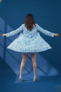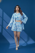 This chic 3-piece cord set is perfect for casual office wear, featuring a fresh white base with a blue floral paisley print. The halter neck crop top is paired with dramatic long bell sleeves, offering a stylish, feminine touch.