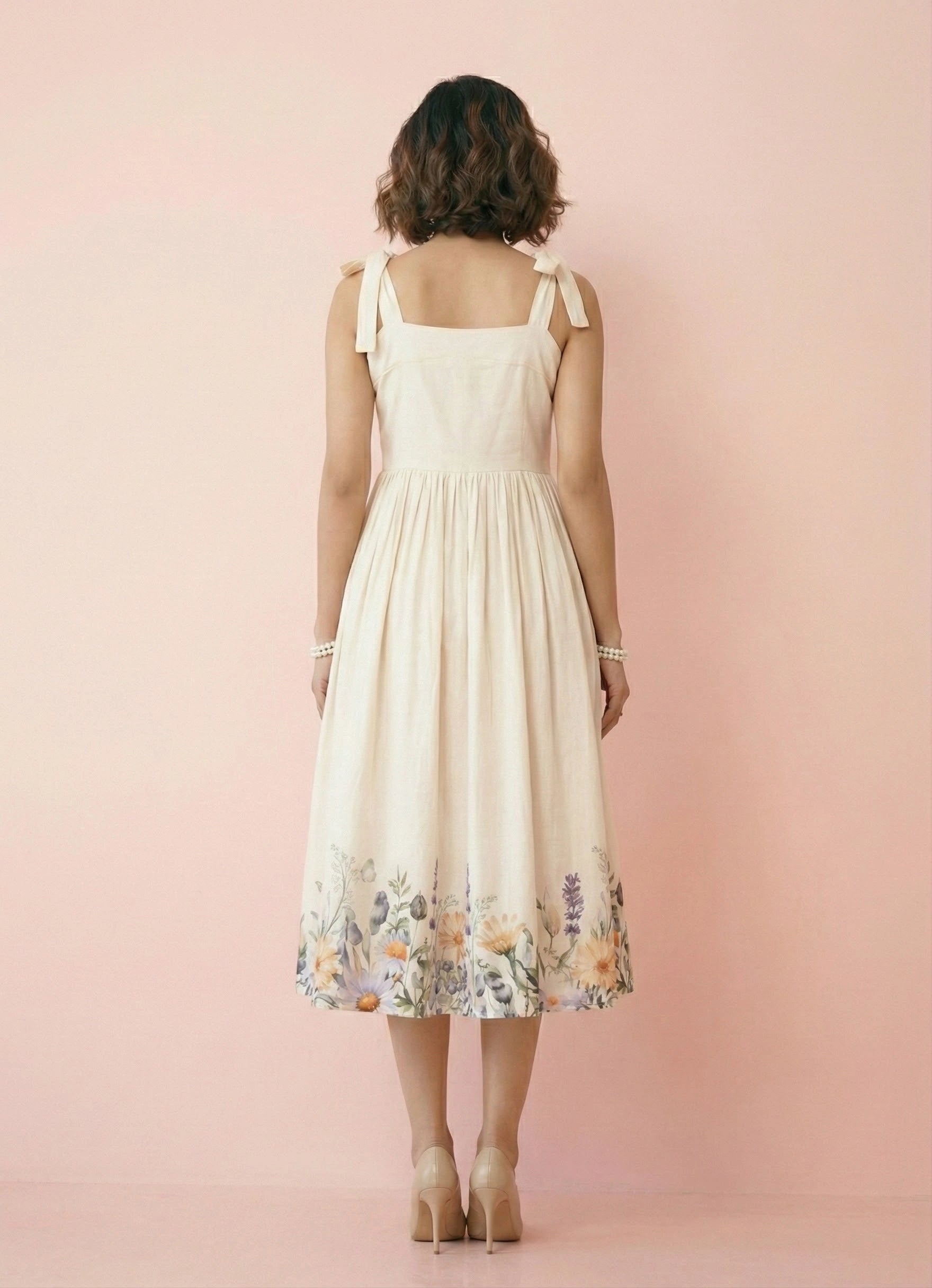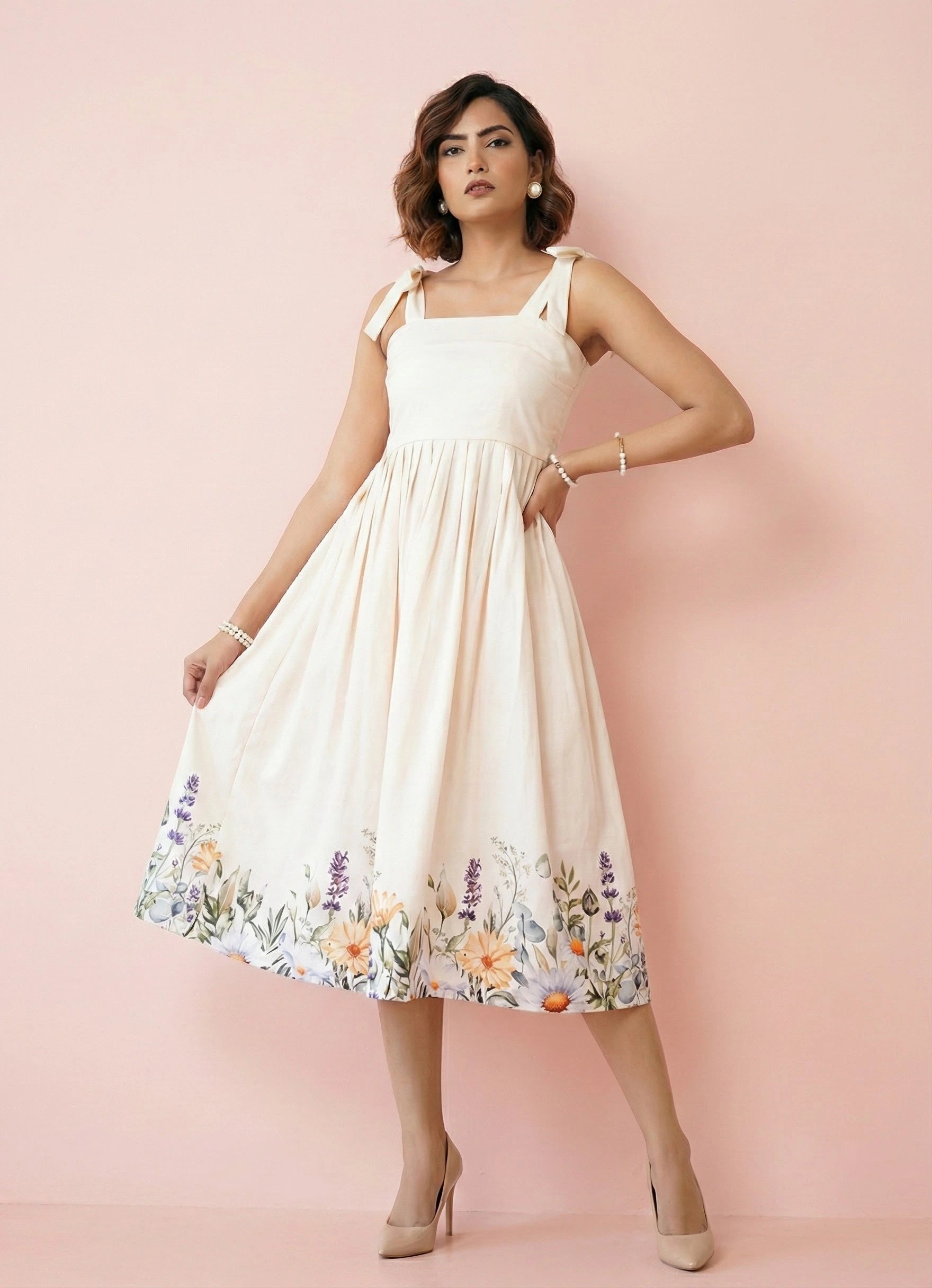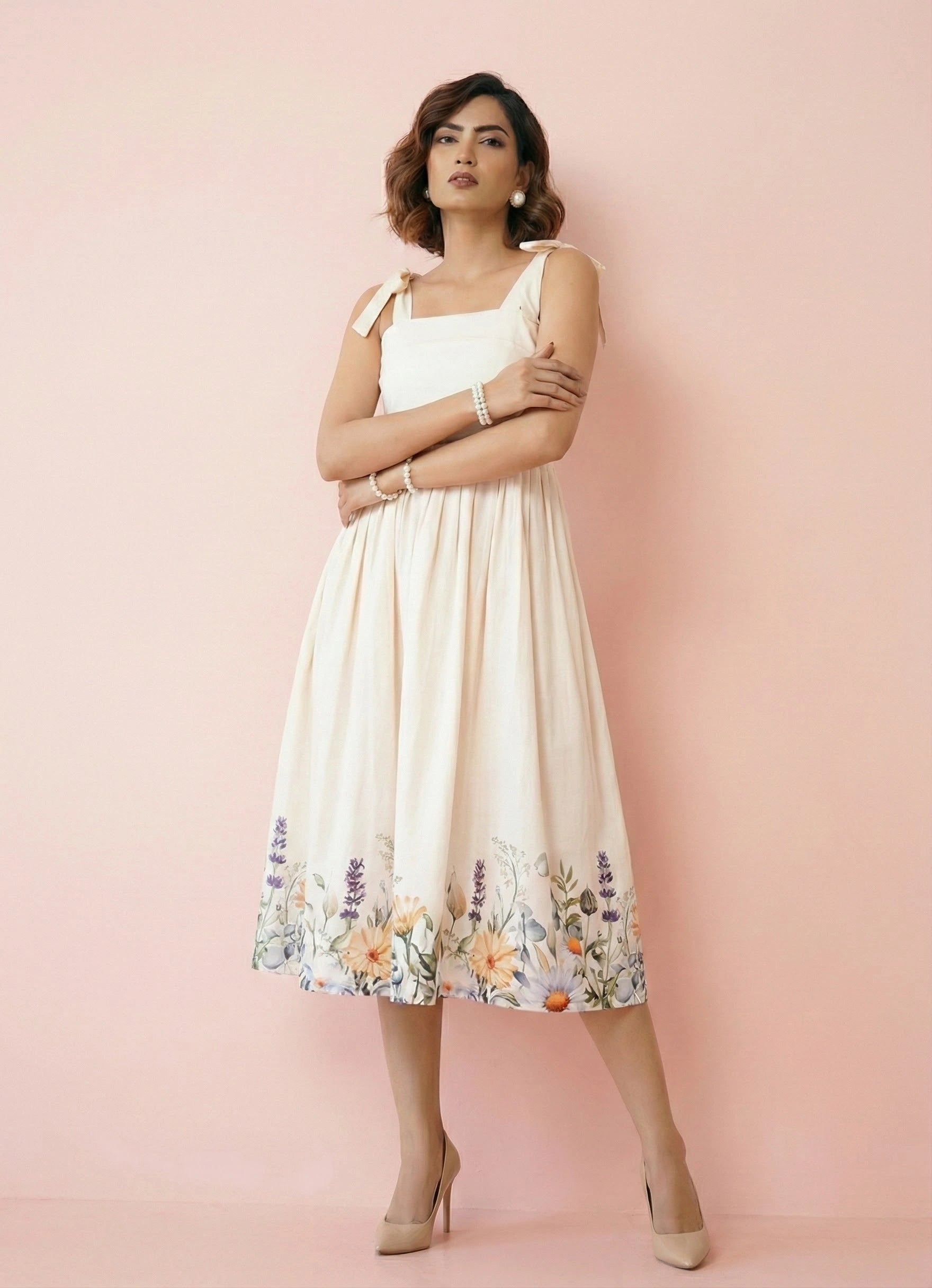 This charming baby powder-colored dress features a sleeveless spaghetti strap design with a delicate floral placement print. Made from Cotton Blend with a digital print finish, it offers both comfort and style. The dress falls below the knee, making it perfect for occasional and regular wear, and is easy to care for with gentle machine wash instructions.
