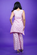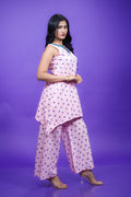 Elevate your everyday elegance with this blush pink high-low co-ord set. The sleeveless top features a graceful boat neckline and a flowing thigh-length silhouette with a motif pattern print, adding a chic touch to your casual or festive looks. Crafted from soft Cotton blend fabric for comfort and breathability, it's paired with full-length palazzo pants in the same motif print. The half belt, half elastic waist ensures a flattering fit, while the gentle machine wash care keeps it easy to maintain. Perfect for both occasional outings and regular wear.