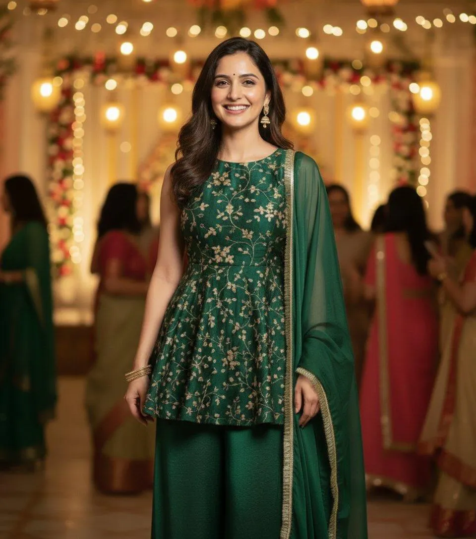 A charming pale blush green peplum set crafted in soft Fandy fabric. Features a sleeveless peplum top with delicate floral jaal embroidery. Designed with a classic round neckline for an elegant touch. Paired with full-length flare pants in matching blush pink tone. Comes with a graceful organza dupatta for a festive flair.