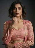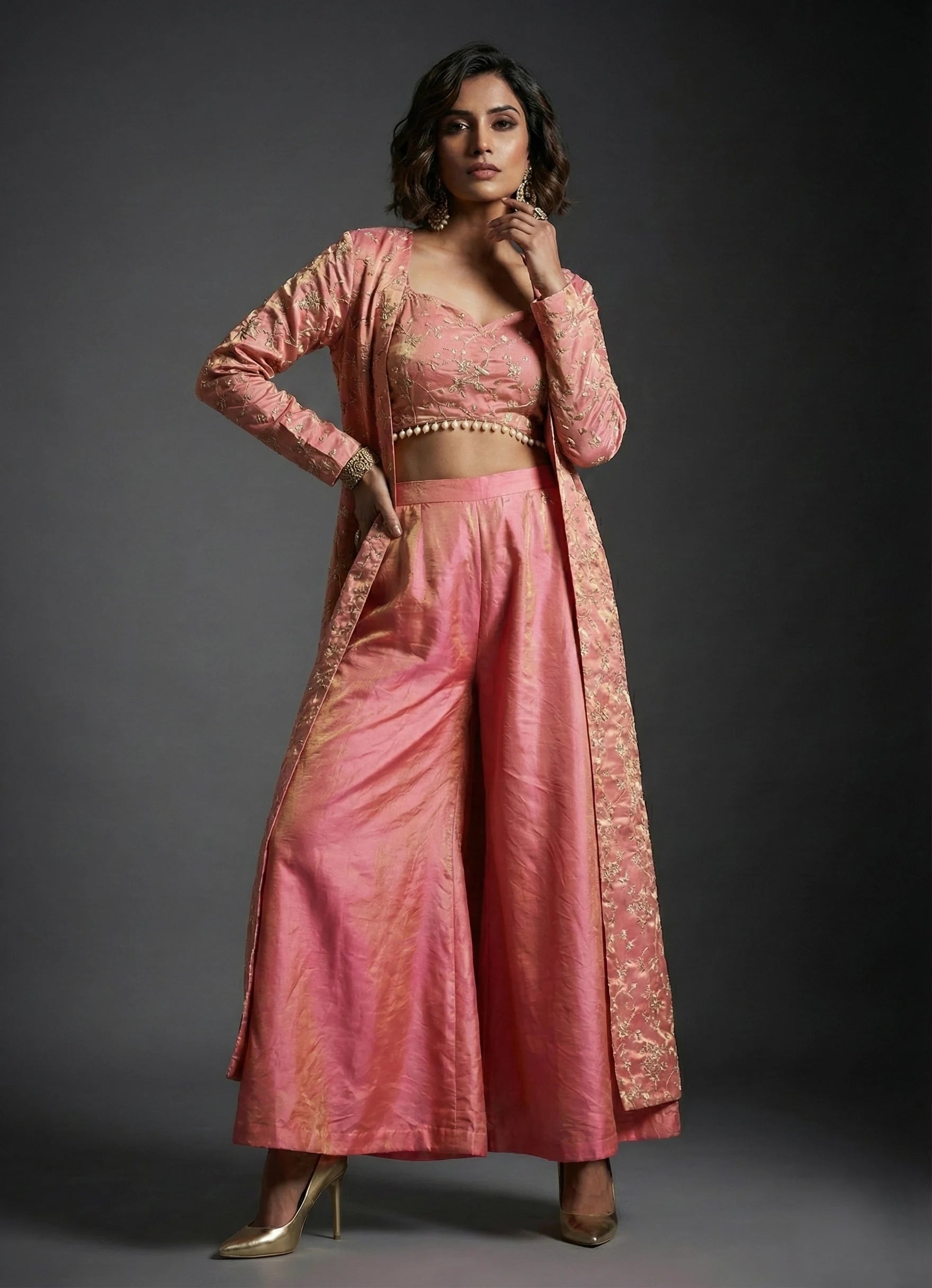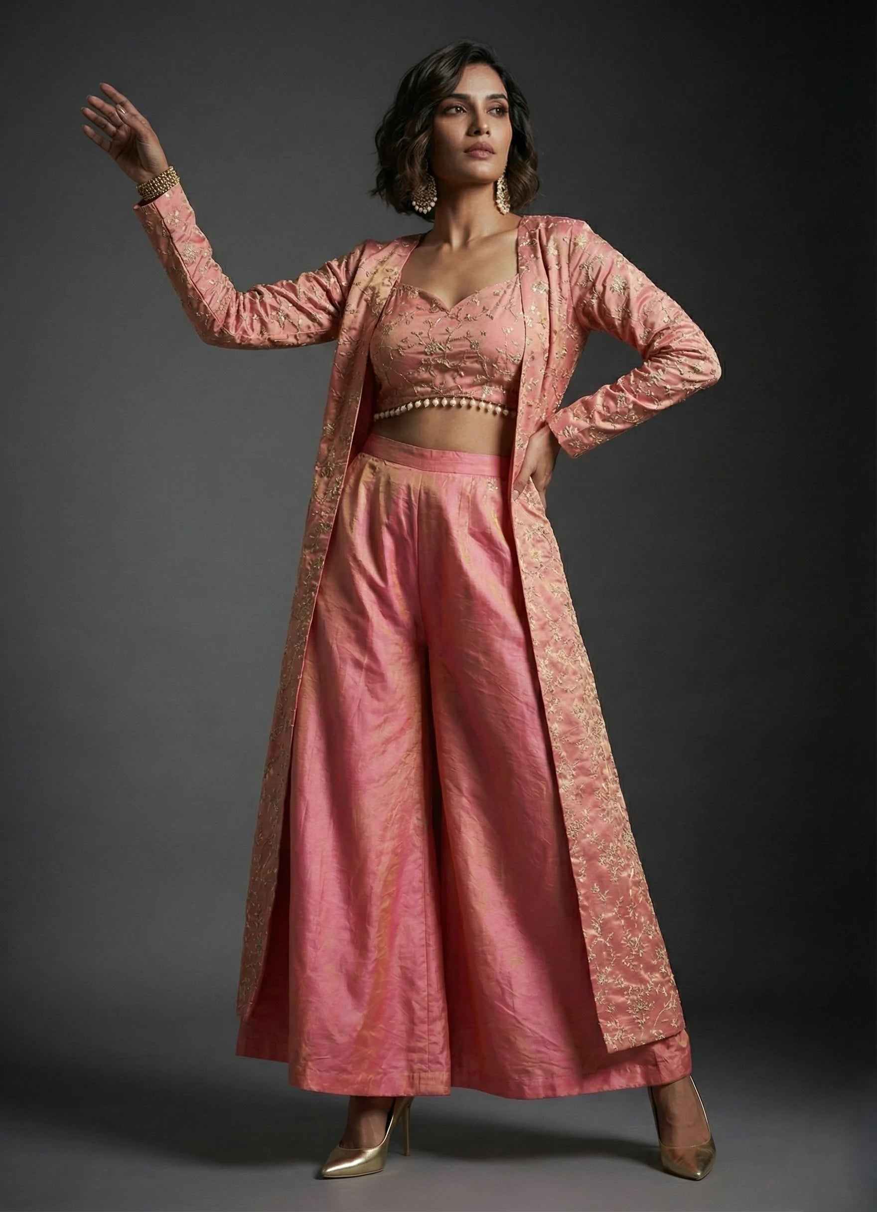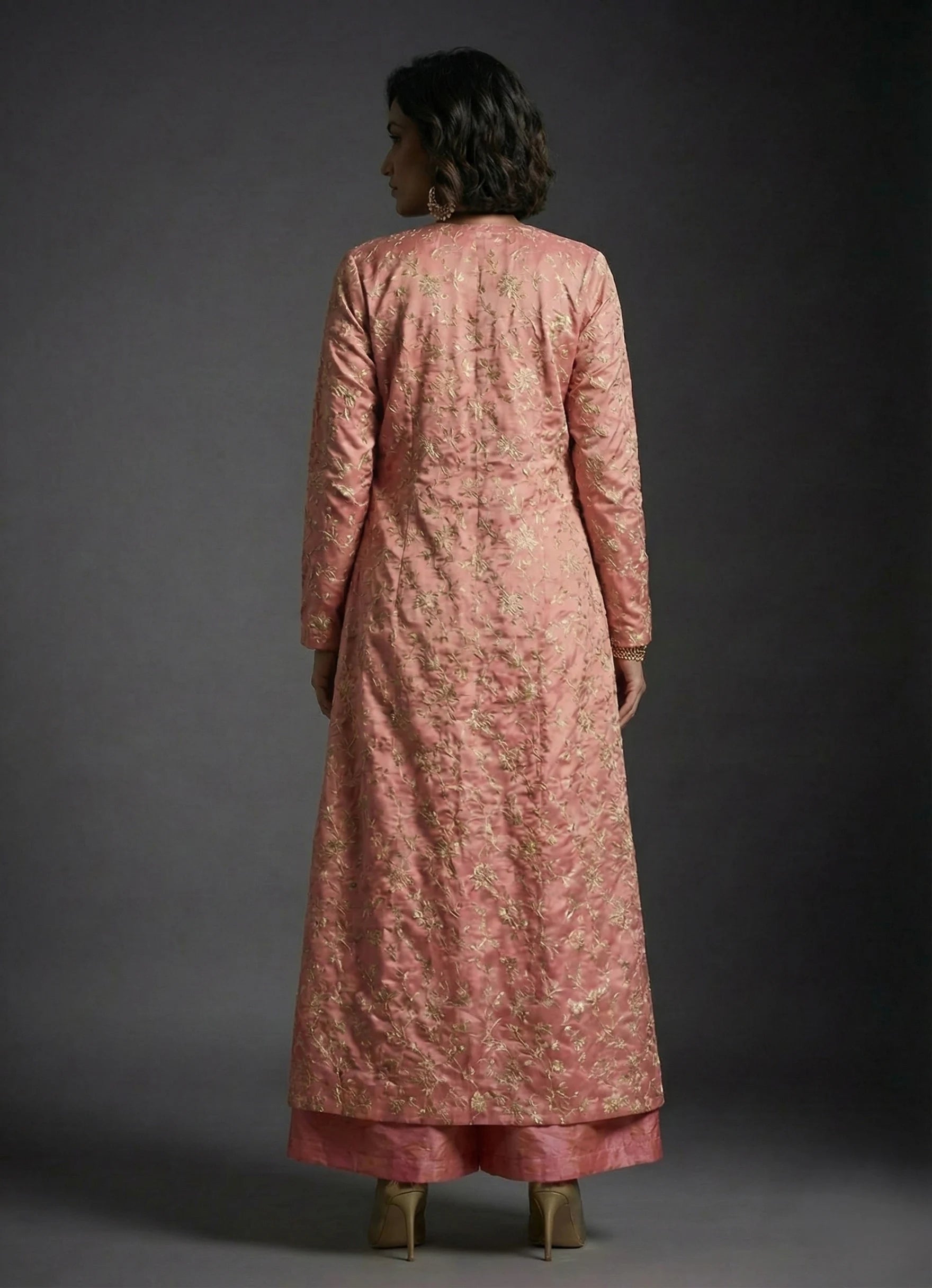 An elegant blush pink three-piece set featuring a full-length embroidered organza jacket. The jacket is styled with full sleeves, plain finish, and delicate floral jaal work. It comes with a matching inner in blush pink and a classic round neckline.