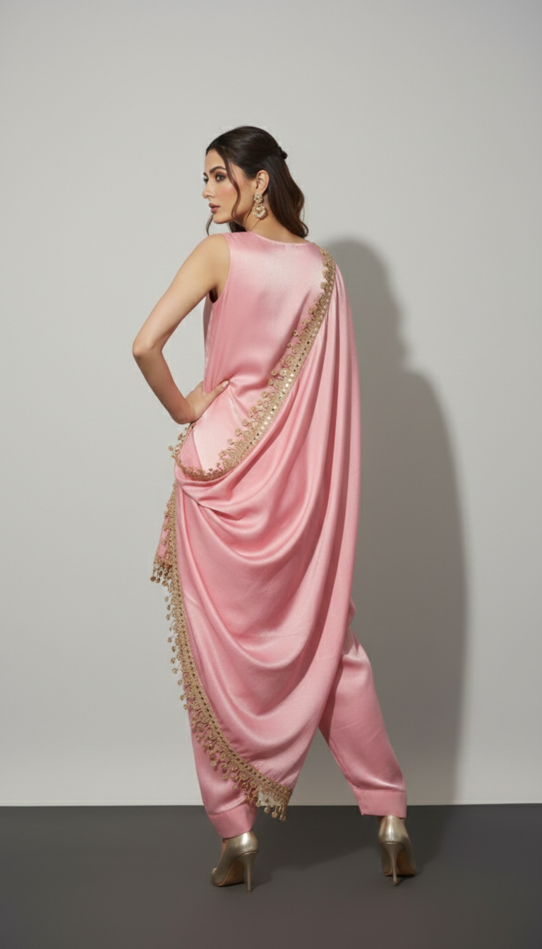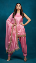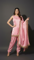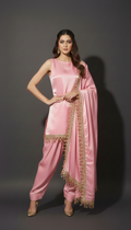 A statement blush pink satin kurti set designed for refined festive elegance. The sleeveless straight-cut kurti features a sleek silhouette with intricate gold lace detailing along the hem. Paired with relaxed-fit satin pants for effortless comfort and a matching dupatta adorned with rich embroidered borders and tassel accents.