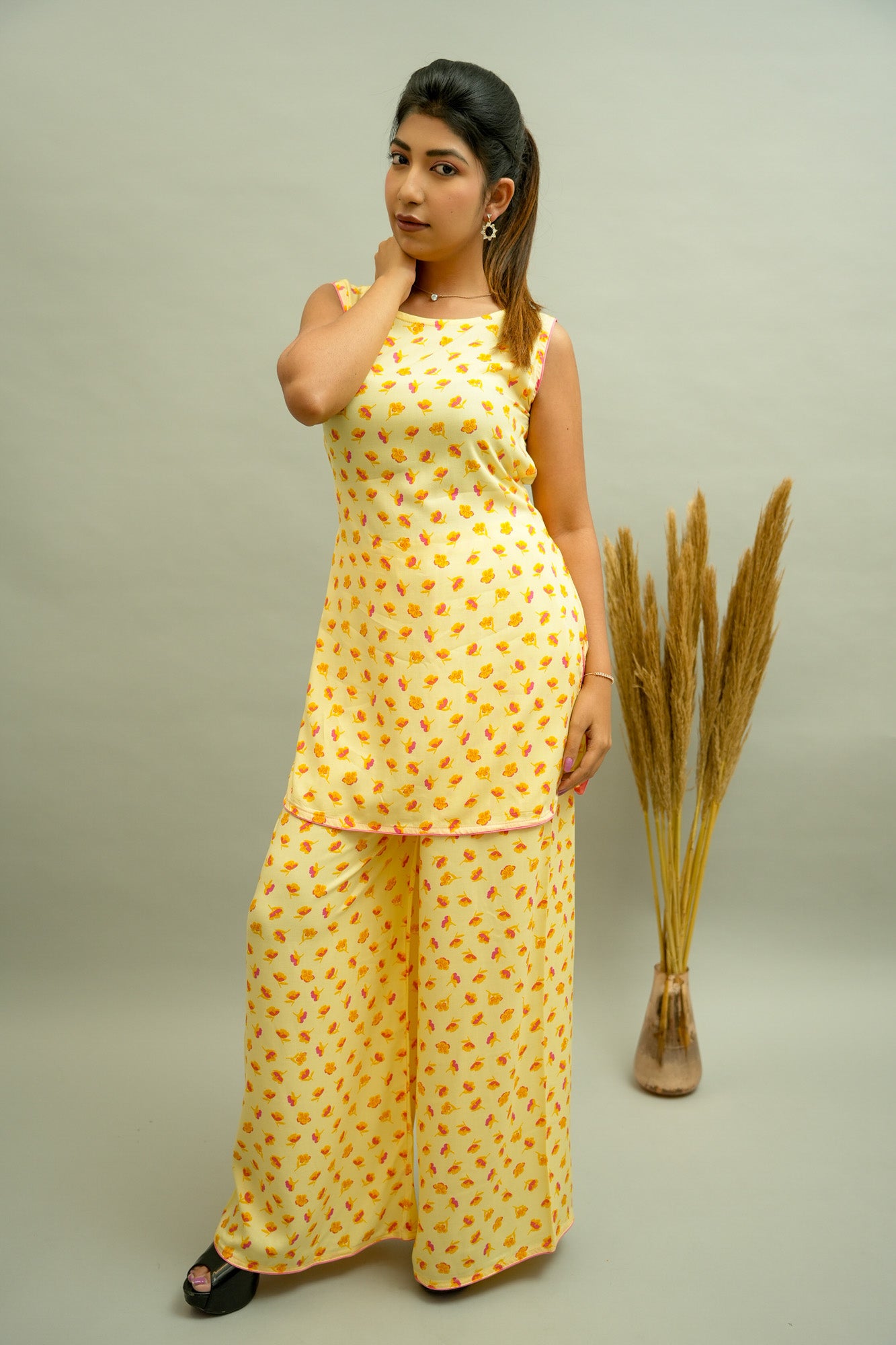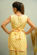 Crafted in soft, breathable cotton fabric, the set features a sleeveless long top in a bright yellow hue, beautifully adorned with a playful pink floral print. The stylish boat neckline and trendy apple-cut hemline give it a modern edge, while the belted waist perfectly cinches your figure for a flattering silhouette.