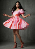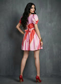This playful bubblegum-colored dress is perfect for both occasional and office wear, offering a chic yet fun style. The above-knee dress features short puff sleeves, a flattering V-neck, and a bold abstract print that adds a touch of artistic flair.