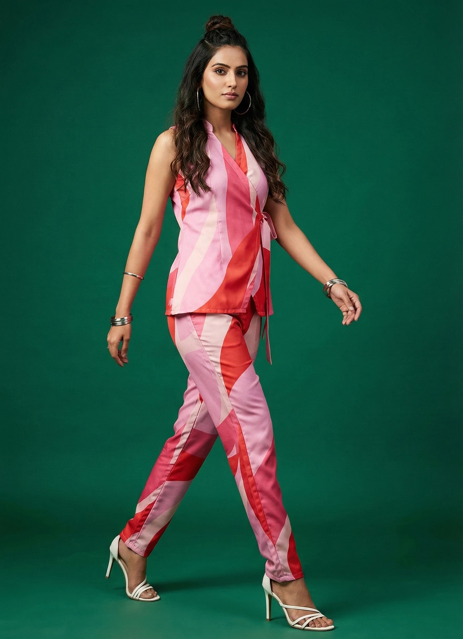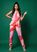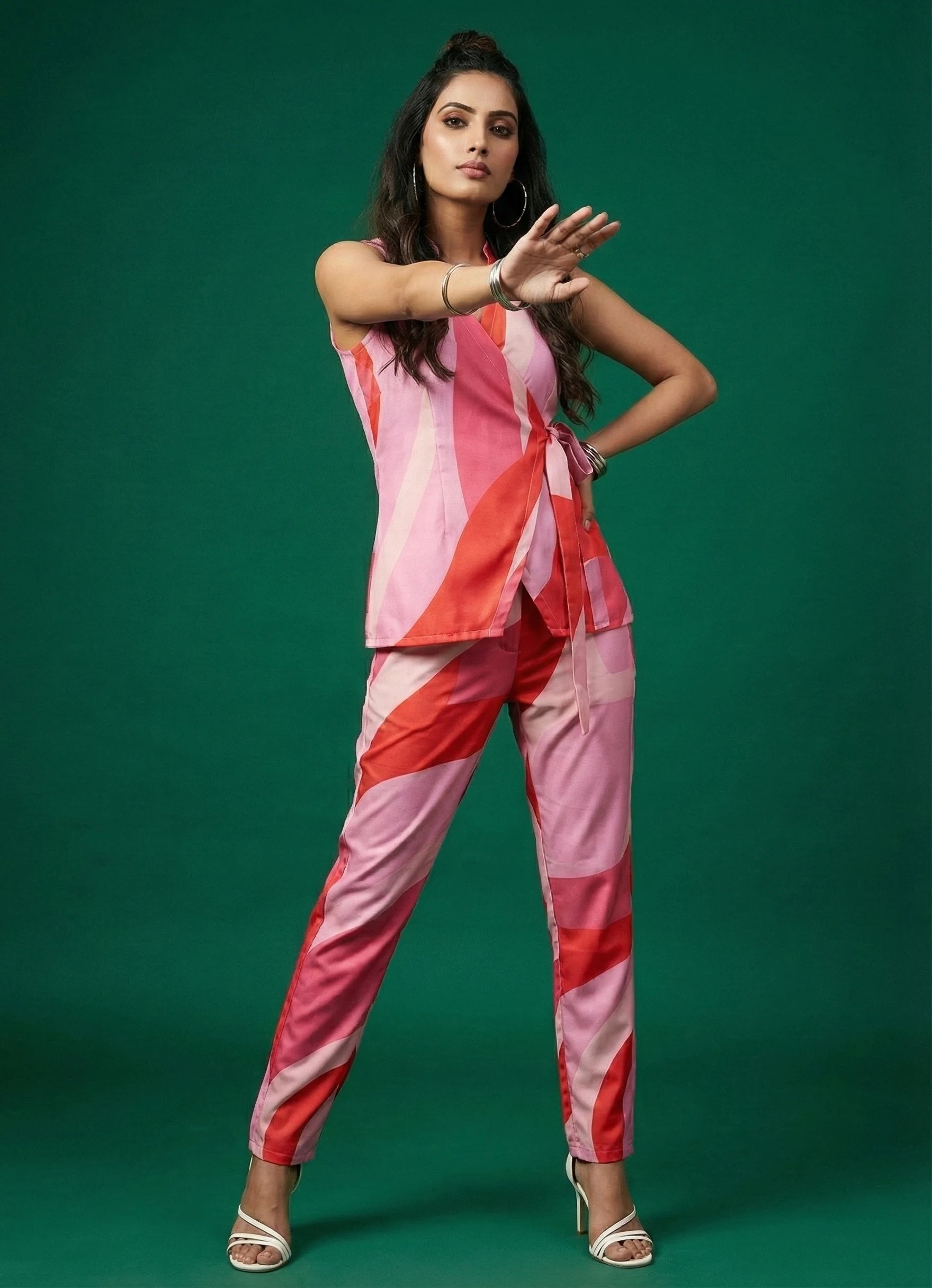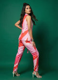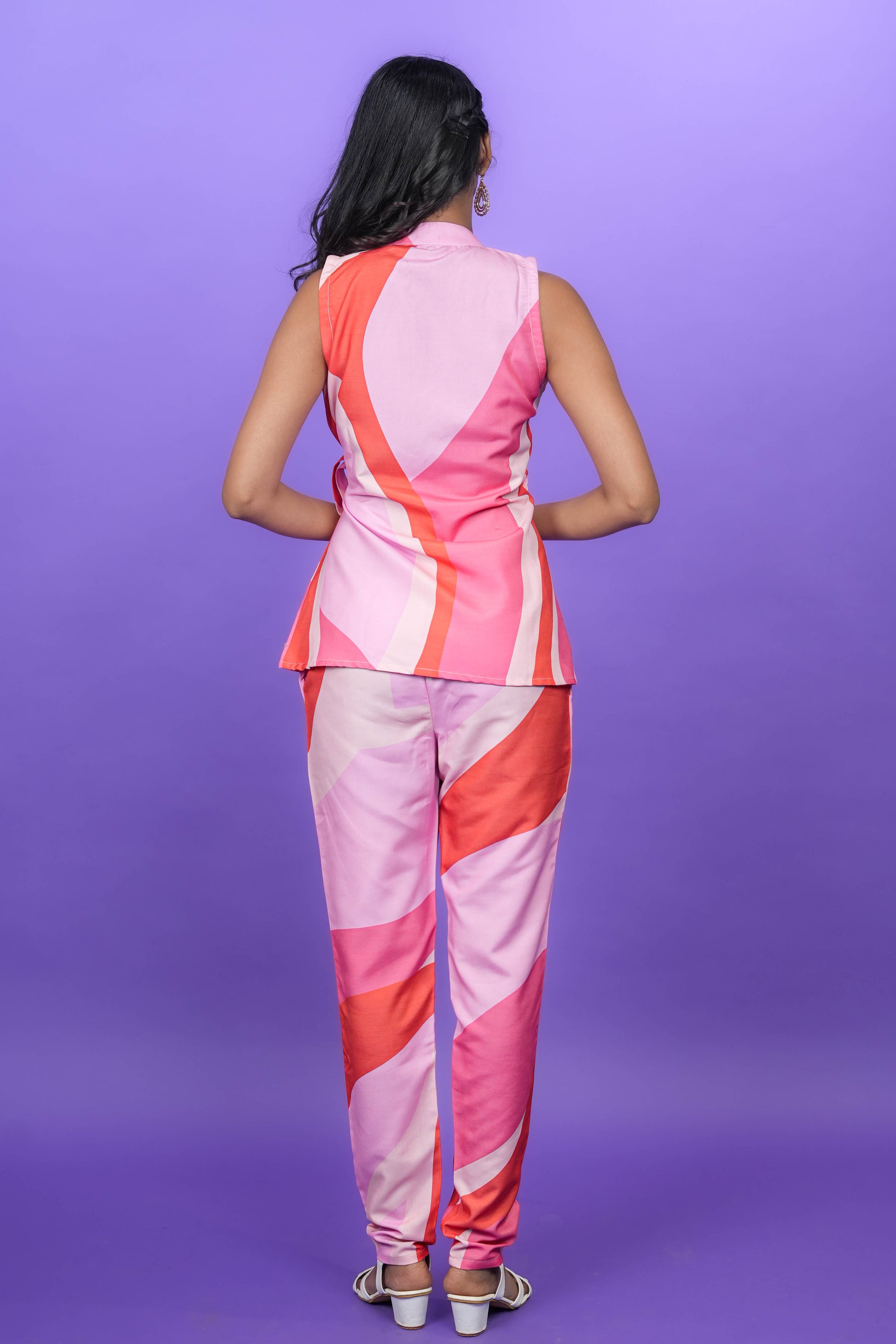 This vibrant bubblegum pink co-ord set is perfect for both office and occasional wear, offering a bold and stylish look. The hip-length sleeveless top features a classic collar neck and is adorned with a dynamic abstract print, adding a modern edge to the design.