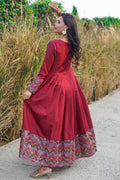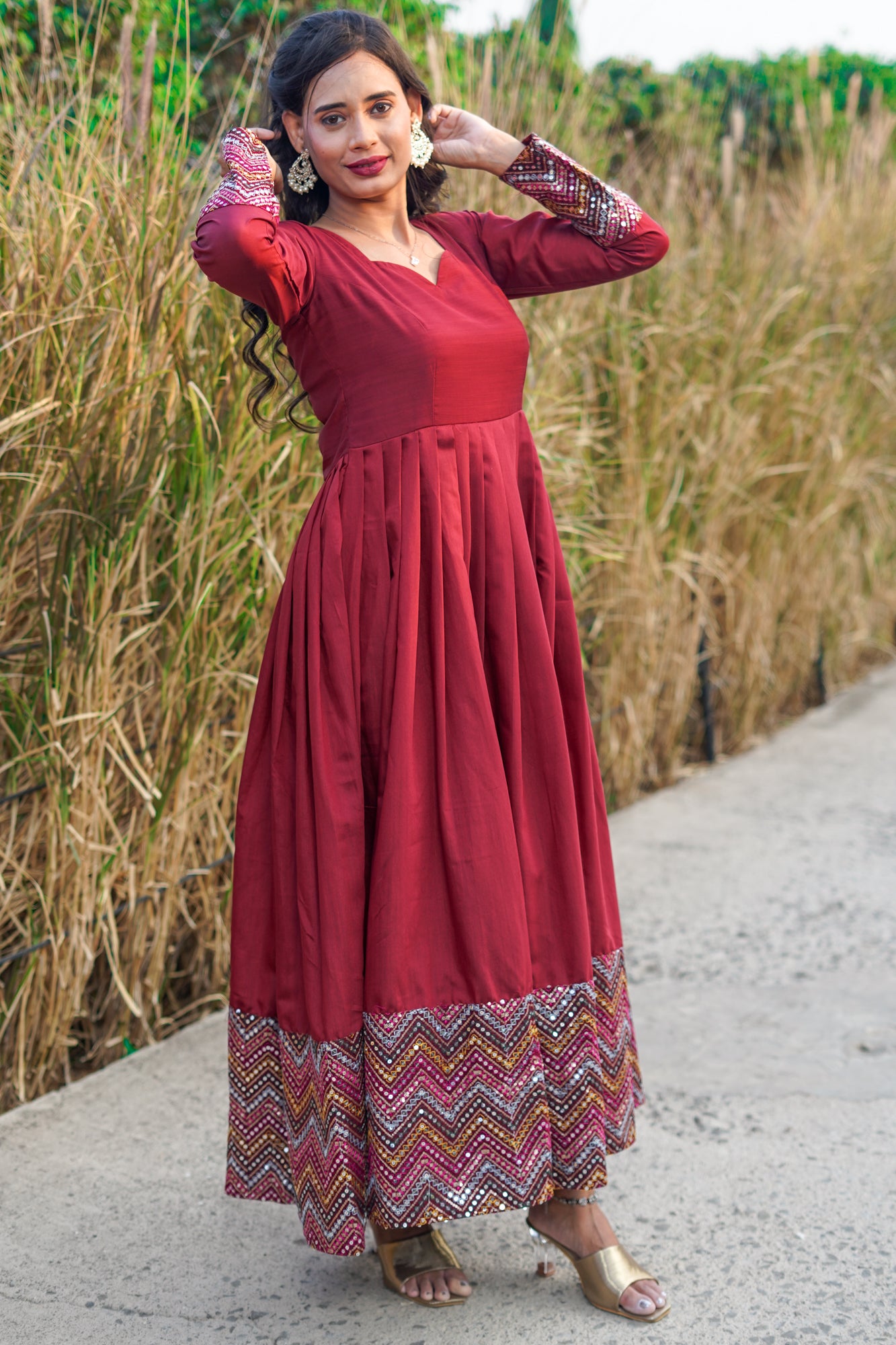Introducing our elegant Burgundy Silk Full-Length Kurti, perfect for festive occasions. Crafted from luxurious silk fabric, this gown features a flattering pentagon neck, Full sleeves with broad cuffs, and full length. The standout feature is the exquisite embroidered broad border, adding a touch of glamour and sophistication to the ensemble. With its classic design and attention to detail, this gown is sure to make you stand out at any special event.