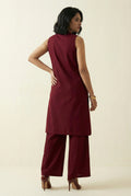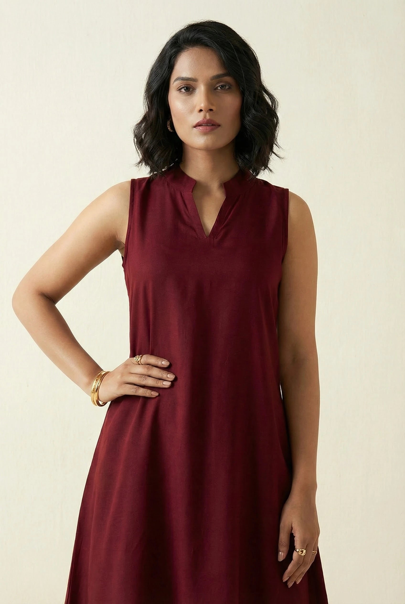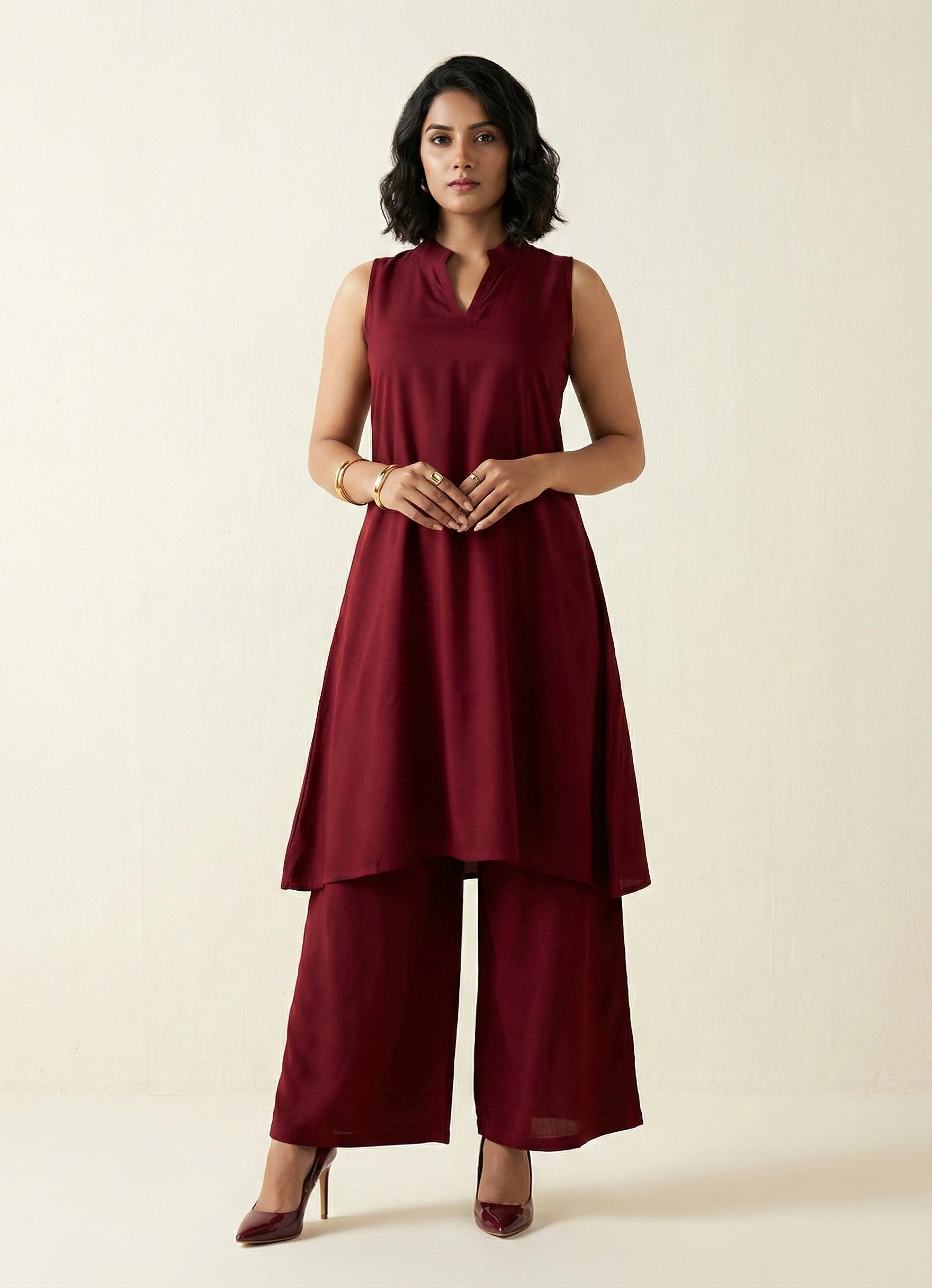 This sophisticated set features a burnt maroon sleeveless collar kurti with a flattering V collar neck and a clean, no-print design. The kurti falls just below the knee, crafted from soft Cotton Blend fabric that is easy to care for with gentle machine wash. It pairs effortlessly with matching burnt maroon full-length palazzo pants, also in a solid tone, featuring a comfortable half belt half elastic closure. Perfect for both occasional and regular wear, this ensemble offers timeless elegance with a minimalist touch.