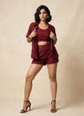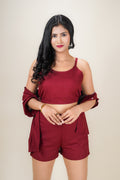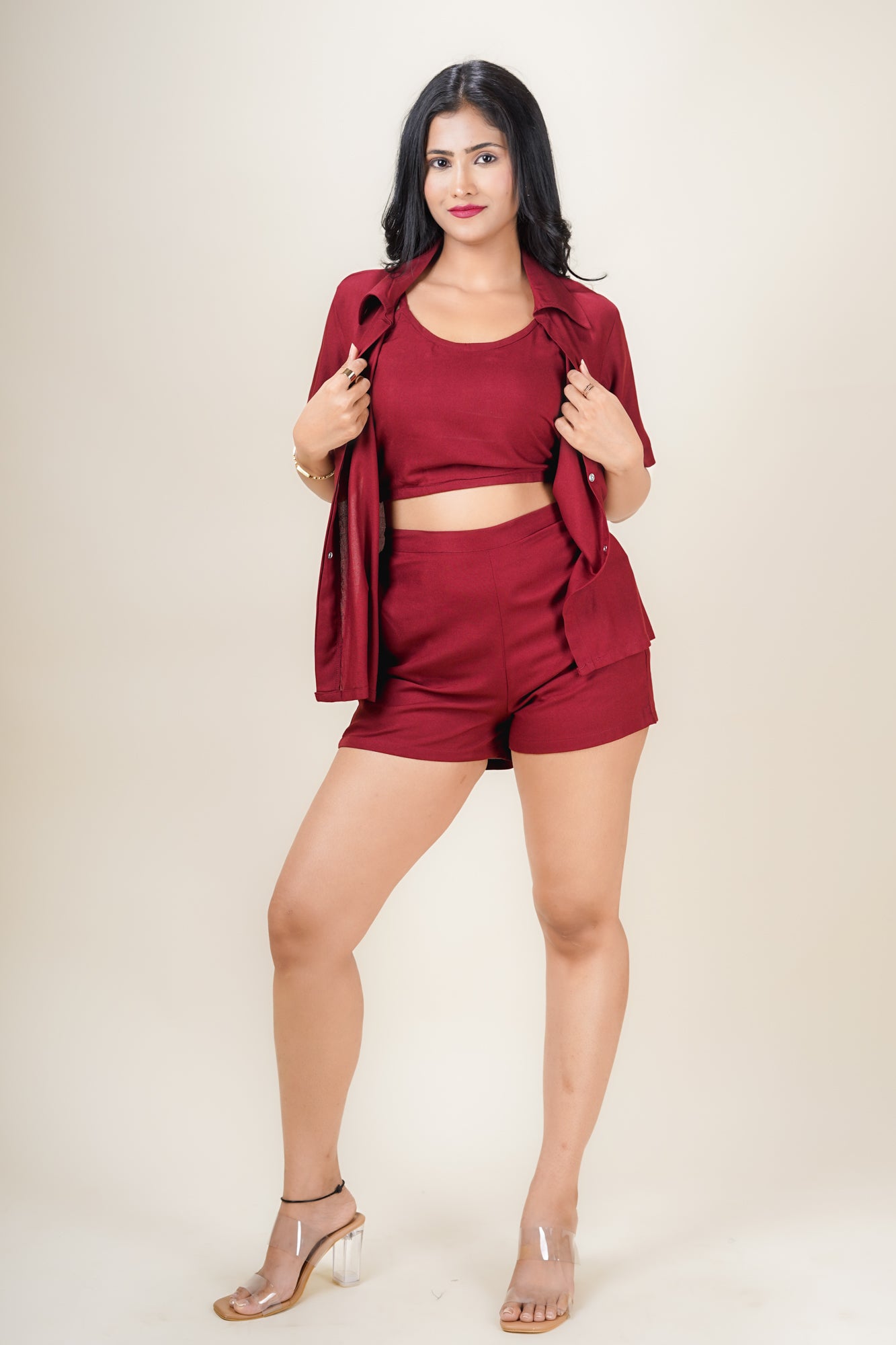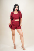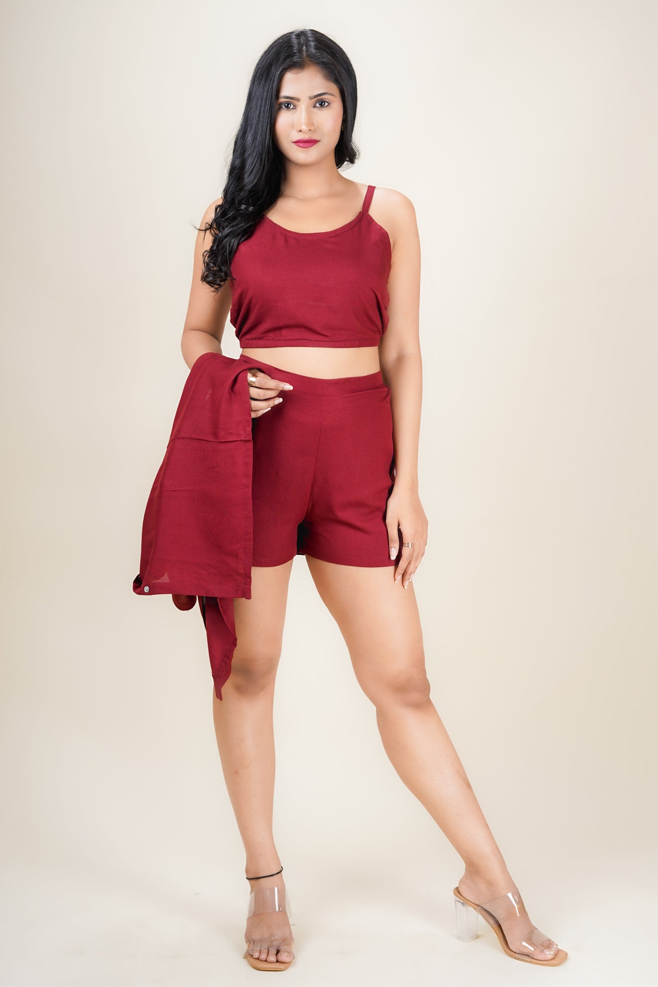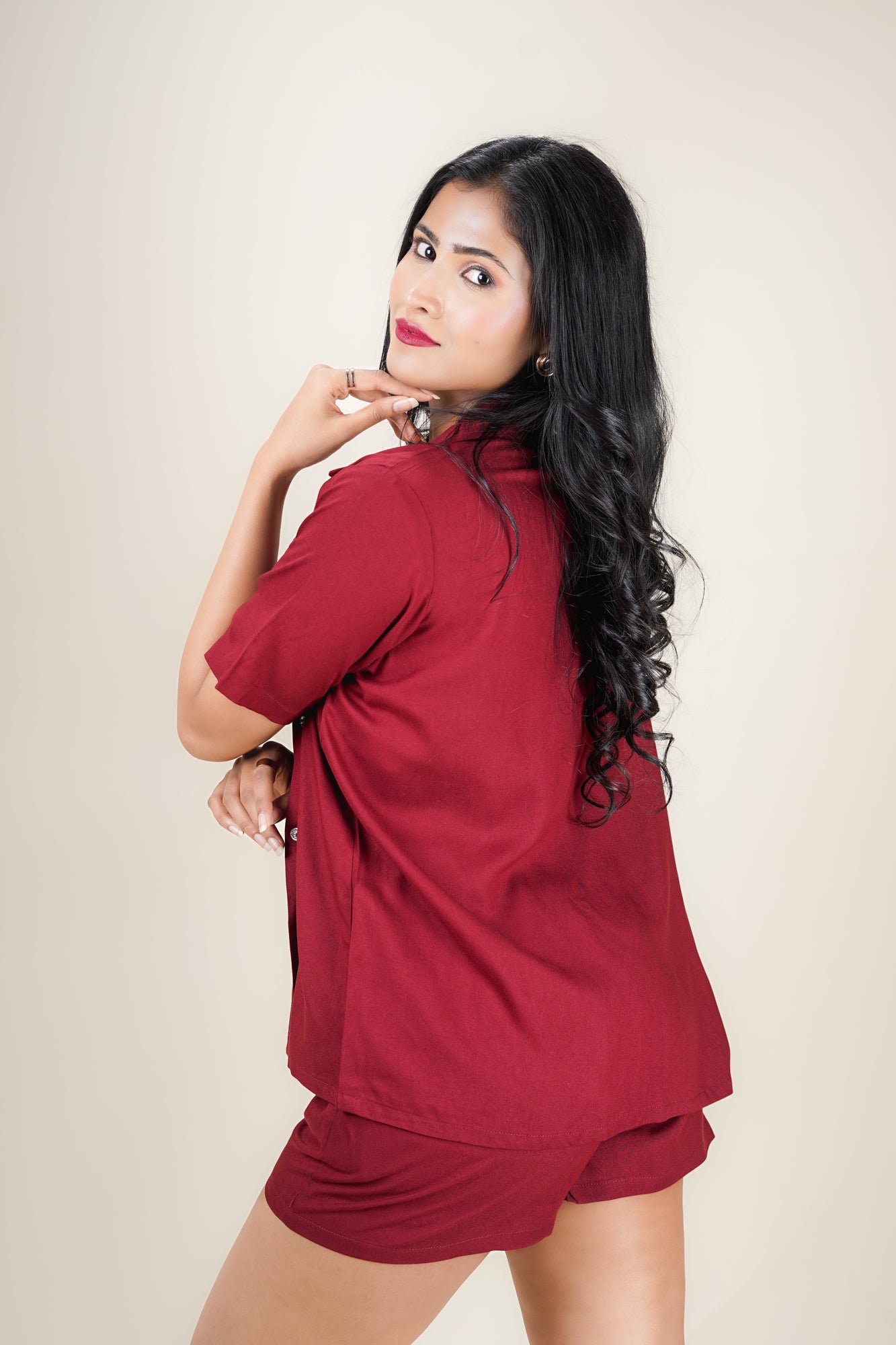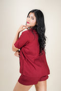 This stylish set features a burnt maroon top with elbow-length plain sleeves and a comfortable round neck. The top is thigh-length and designed with a matching burnt maroon inner layer for added style and coverage. Made from soft, breathable Cotton blend fabric with no print, it is easy to maintain with gentle machine wash. The set includes coordinating burnt maroon shorts-style pants with an above-knee length and a convenient half belt half elastic closure. Perfectly suited for both occasional and office wear, this ensemble combines elegance with effortless comfort.