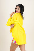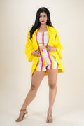 Step into effortless elegance with this candy-colour co-ord set featuring a stylish thigh-length jacket with graceful ¾ bell sleeves and a classic round neck. The set includes a printed inner top and matching striped bottoms in a blend of vibrant candy hues. Designed in soft Cotton blend fabric for all-day comfort, the half-belt, half-elastic pants add ease to your office or occasional wardrobe. A playful yet polished ensemble perfect for making a statement.