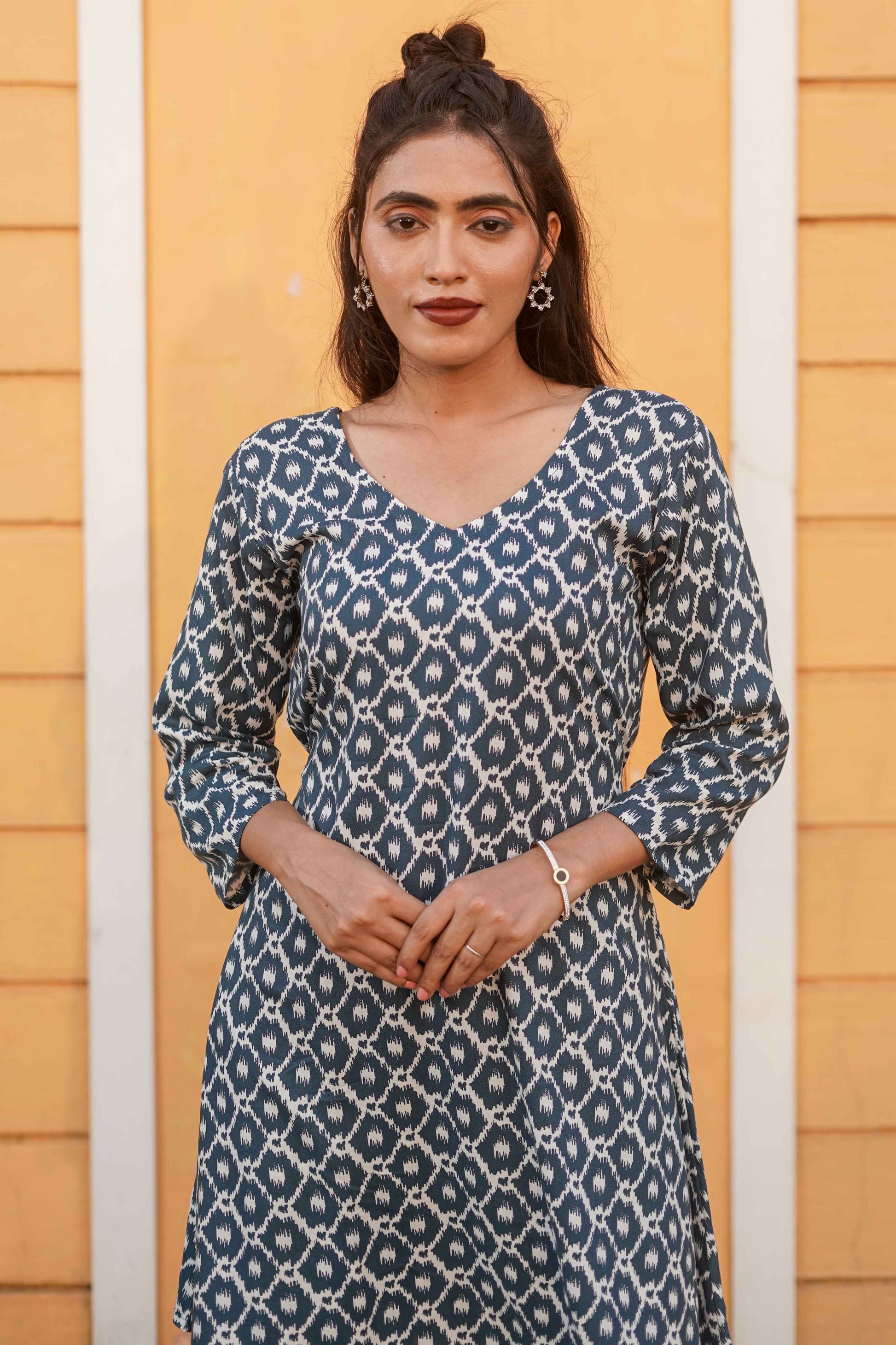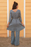 This celestial blue co-ord set is a striking and well-coordinated outfit designed for style and comfort. Designed from ikat printed Cotton Blend fabric creates balanced and visually appealing look. Top consists of a rounded V neckline, A-line silhouette, three-fourth sleeves and drawstrings attached in form of belt on waist for a perfect fit. This top is paired up with same flared pants creating a beautiful look.