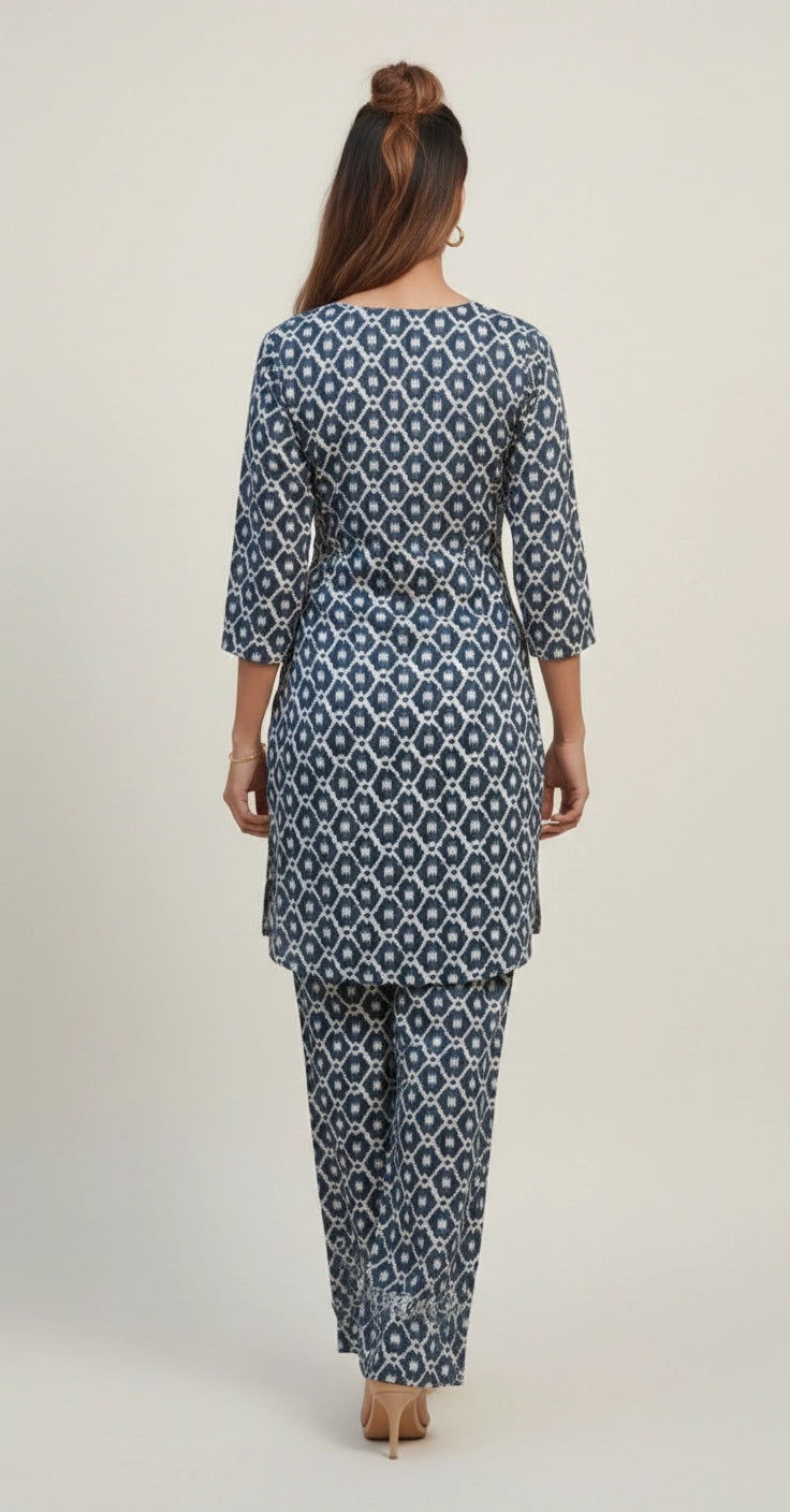 This celestial blue co-ord set is a striking and well-coordinated outfit designed for style and comfort. Designed from ikat printed Cotton fabric creates balanced and visually appealing look. Top consists of a rounded V neckline, A-line silhouette, three-fourth sleeves and drawstrings attached in form of belt on waist for a perfect fit. This top is paired up with same flared pants creating a beautiful look.