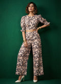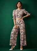 The crop top features a round neck, ruffle elbow sleeves, and a charming floral paisley print. Paired with full-length bottoms designed with a half-belt, half-elastic waistband for comfort, this set blends elegance and ease.