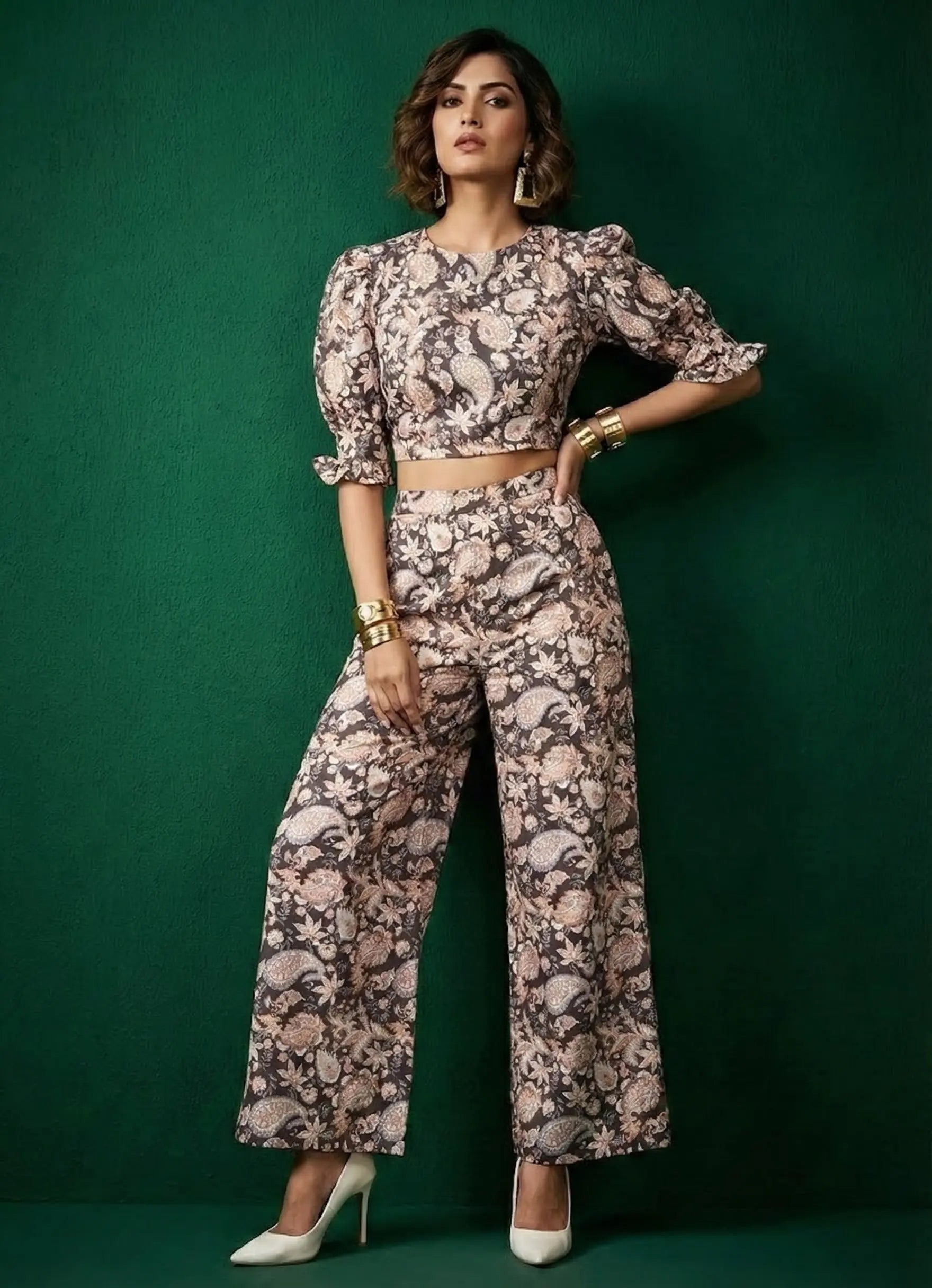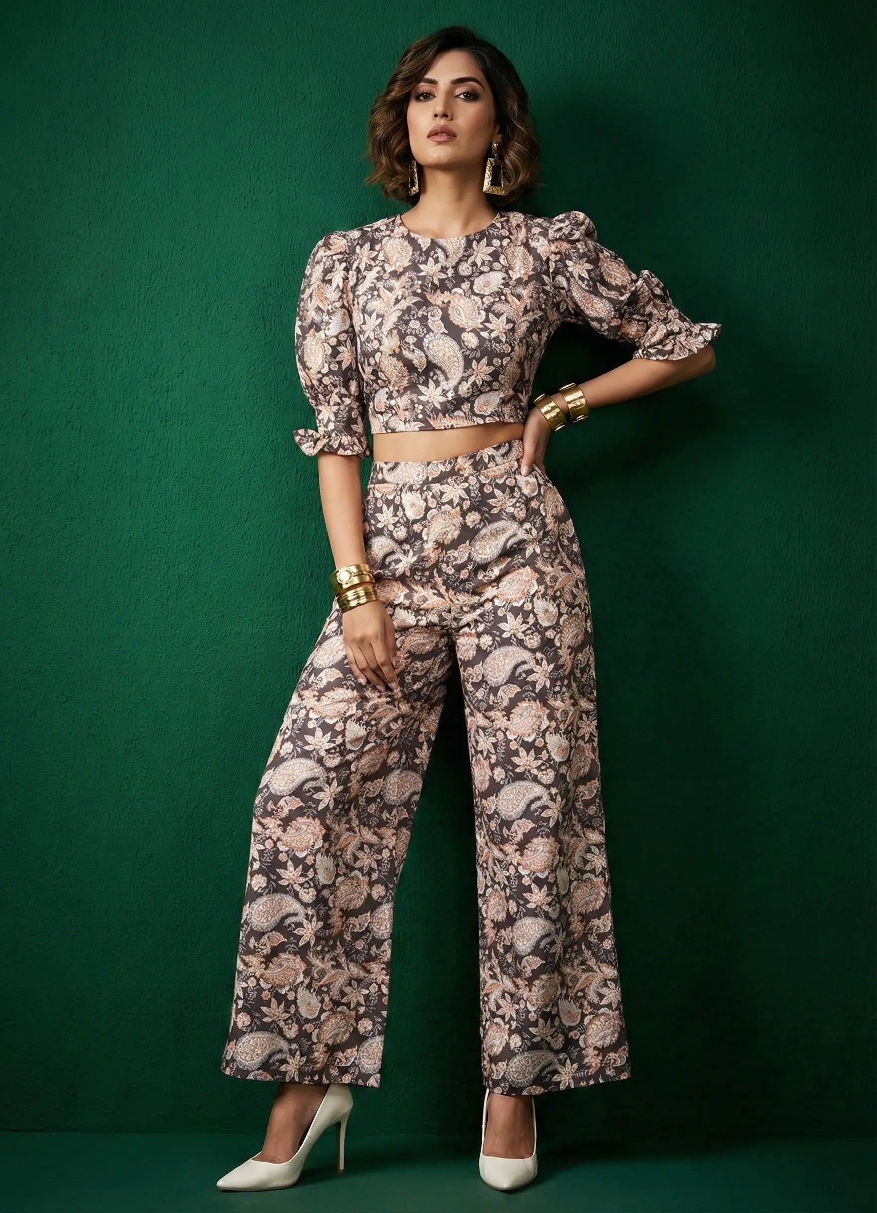 Elevate your style with this chic chocolate brown floral paisley co-ord set, perfect for casual and occasional wear.