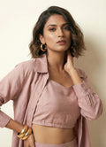 The matching coffee-colored bottoms, designed with a half-belt, half-elastic waistband, offer a flattering fit that sits just above the knee. This set provides a chic and comfortable option for everyday wear.