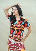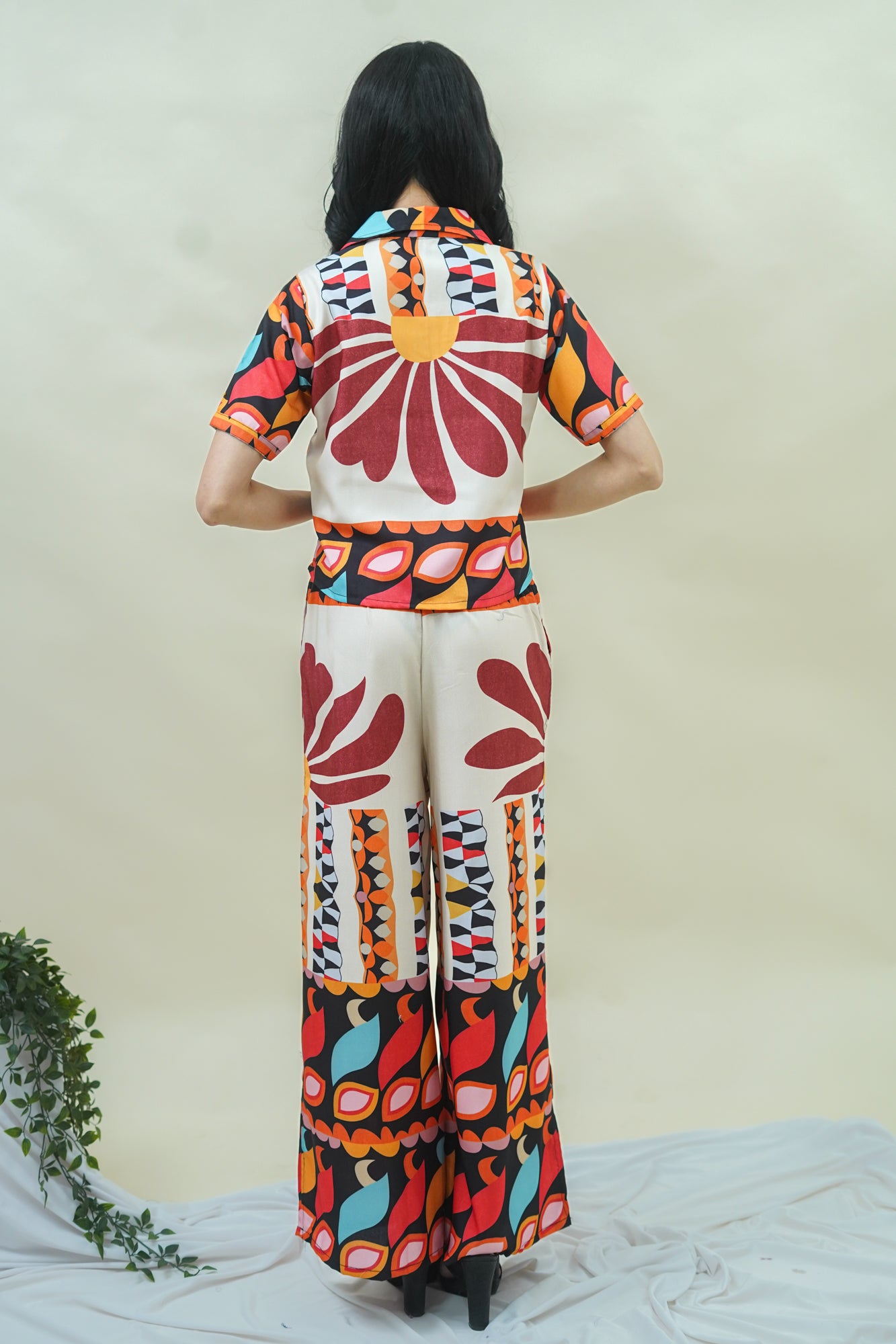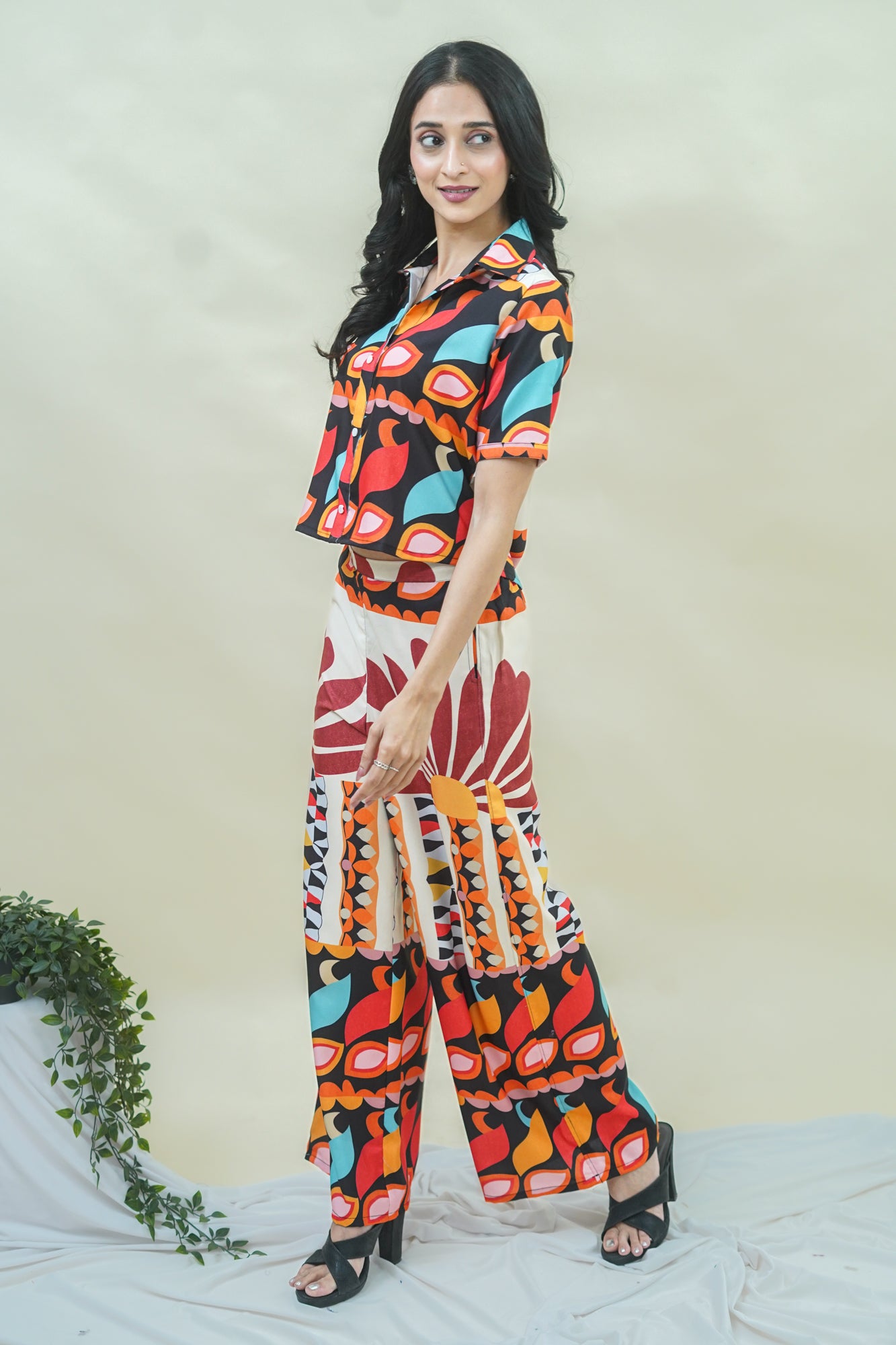 Add a pop of color to your wardrobe with this vibrant multi-colour shirt and pant set! The short-sleeved shirt features a classic collar neck, plain sleeves, and a striking placement print that makes a statement. The matching pant has a comfortable full-length design with a half belt and half elastic closure, providing a flattering fit.