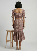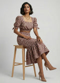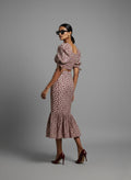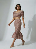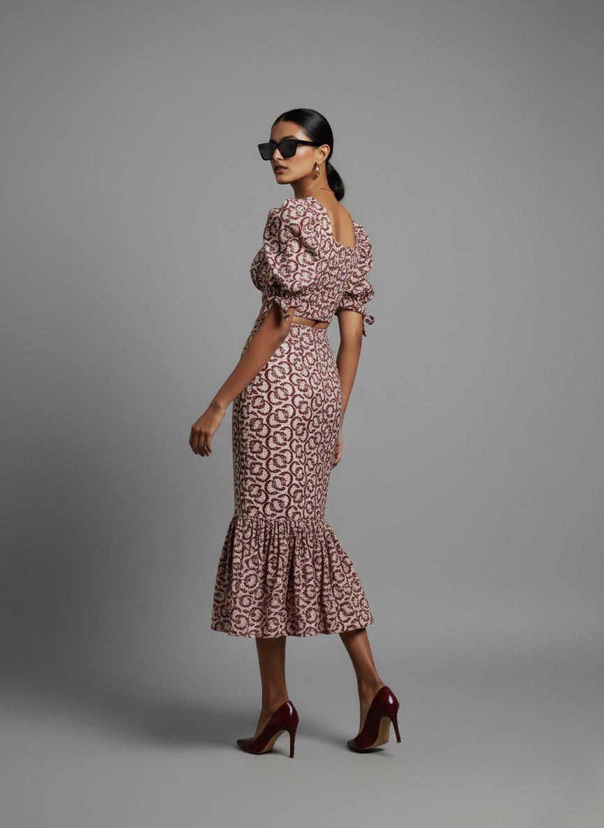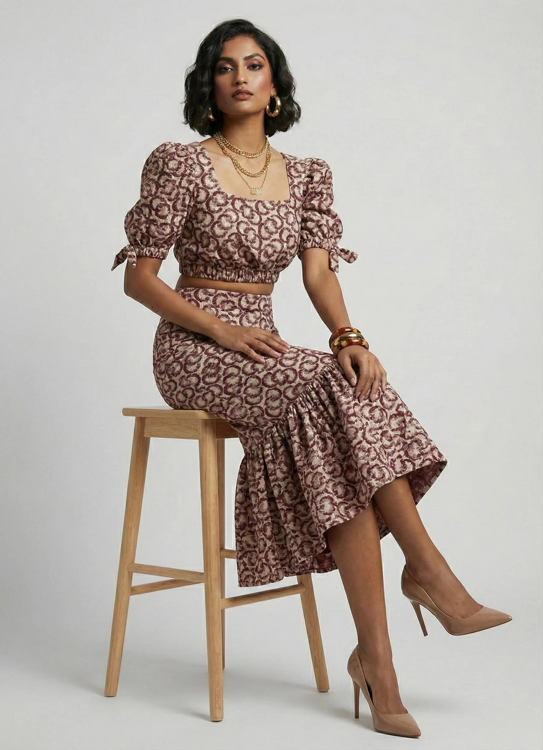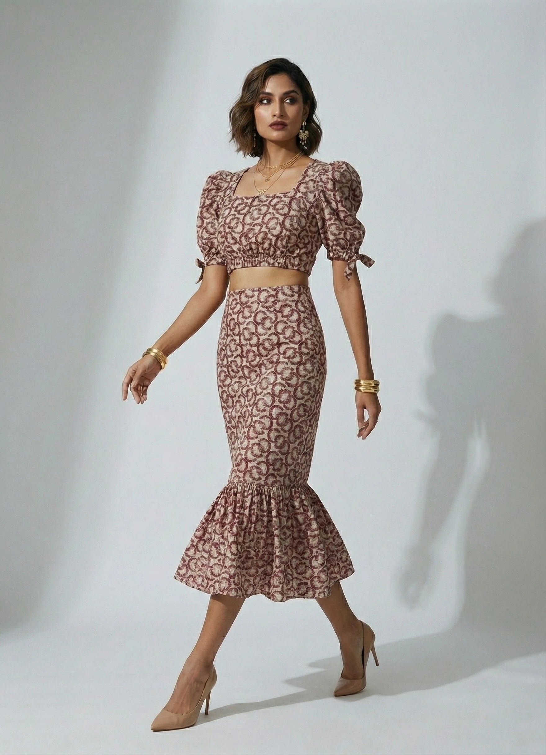 A chic coral pink cotton blend crop top with puff sleeves, square neck, and mini length paired with a matching full-length mermaid skirt in chain print, perfect for both regular and occasional wear. The stylish crop top enhances a youthful vibe, while the mermaid skirt adds a graceful, flowy silhouette. Designed in soft cotton blend fabric, it offers comfort with elegance and is easy to maintain with gentle machine wash. The half-belt, half-elastic closure ensures a perfect fit, making it a versatile outfit for casual outings, parties, or festive gatherings.