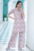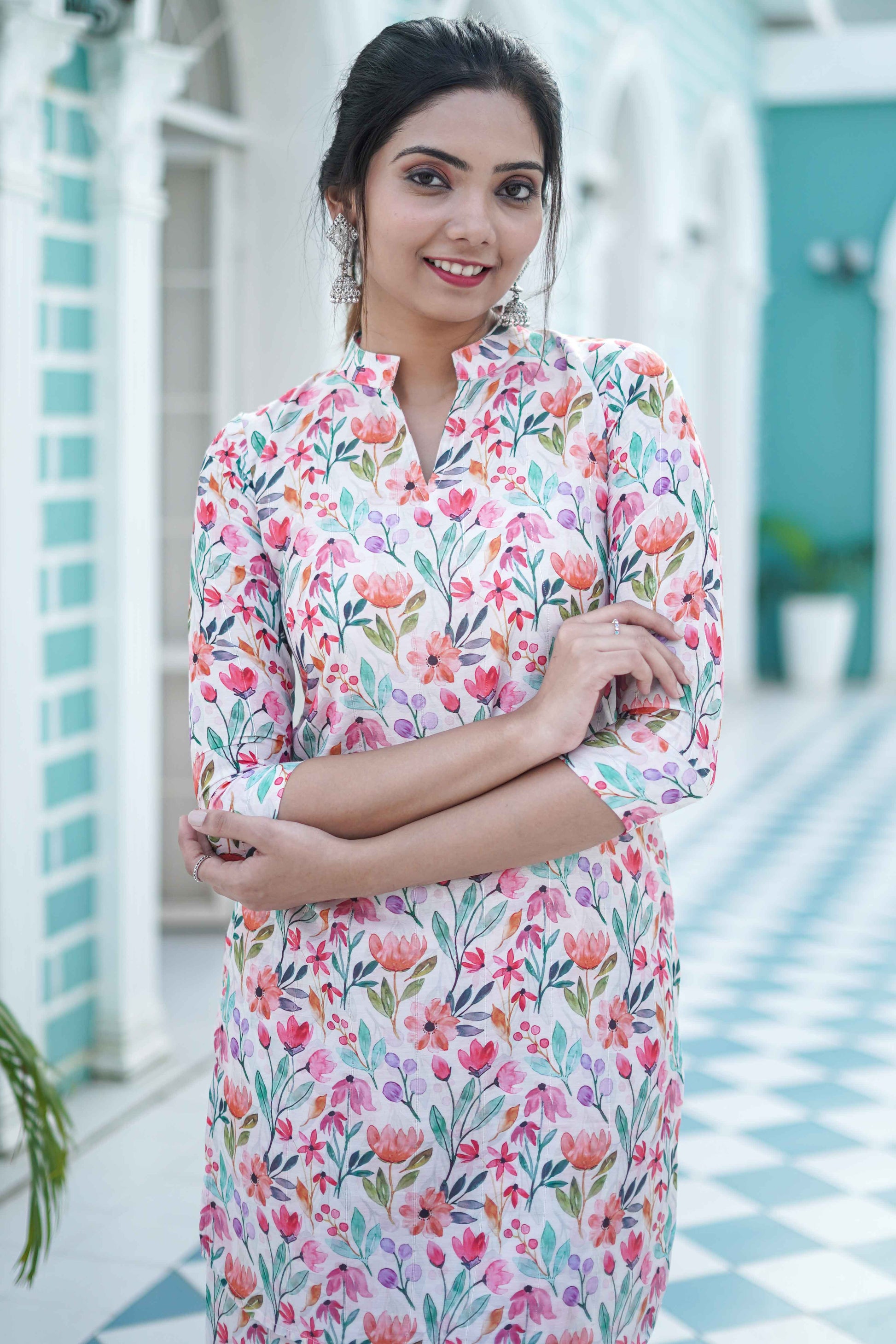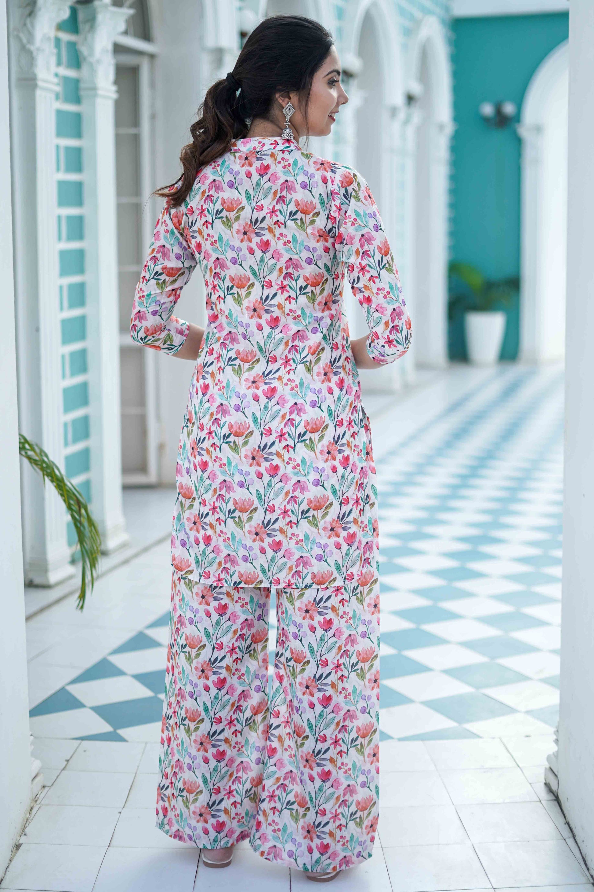 A trendy pattern that everyone should have in their festive or day to day collection. Multi-coloured floral printed co-ord set designed out from cream coloured Cotton Blend fabric has a collared neck with V cut, three-fourth regular cut sleeves and regular two side slit cut short kurta pattern paired up with same printed pants.