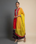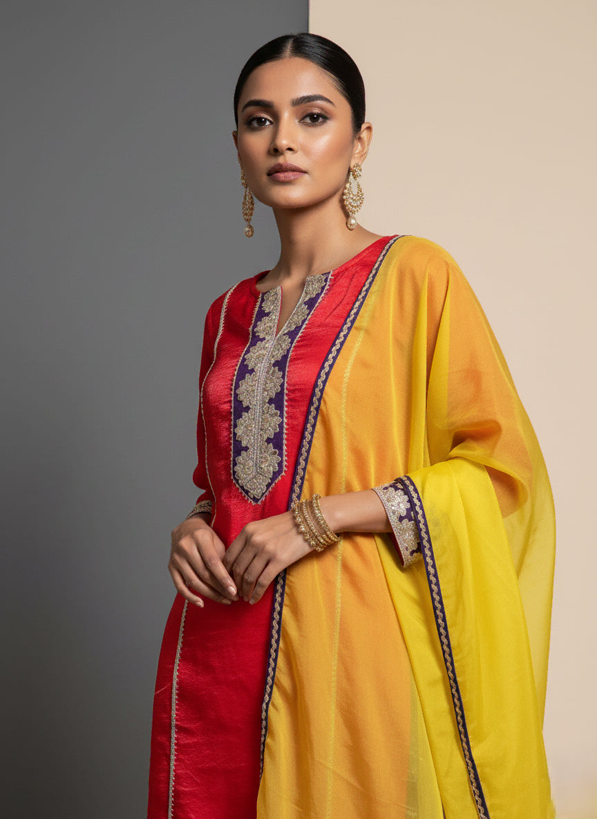 Paired with purple palazzo pants adorned with subtle stripe embroidery. Completed with a contrasting yellow dupatta for a festive touch.