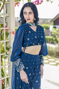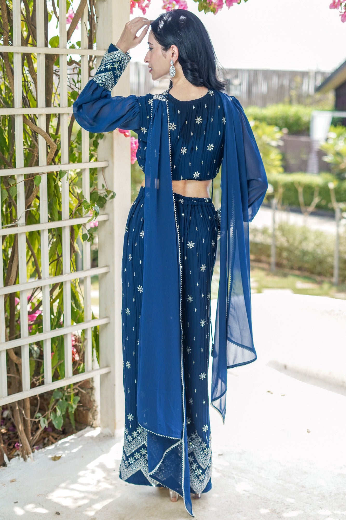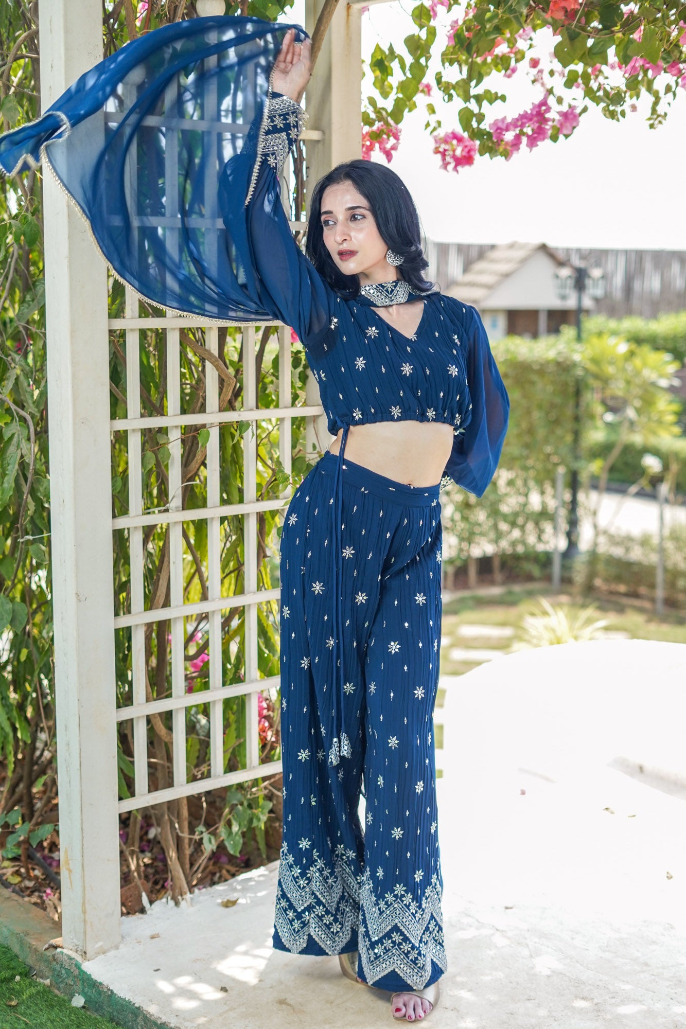 Introducing our Silhouette ensemble: featuring a stylish top paired with intricately embroidered palazzo pants and a silver lace dupatta, perfect for festive occasions. Crafted from crush Georgette fabric in a vibrant blue hue, the top boasts Full sleeves with cuff detailing and a flattering V-neck, exuding elegance. With a top length of 16 inches and full-length palazzo pants, this ensemble promises both style and comfort for your festive celebrations. The silver embroidery on the palazzo pants adds a touch of sophistication, while the matching silver lace dupatta completes the look with flair.