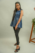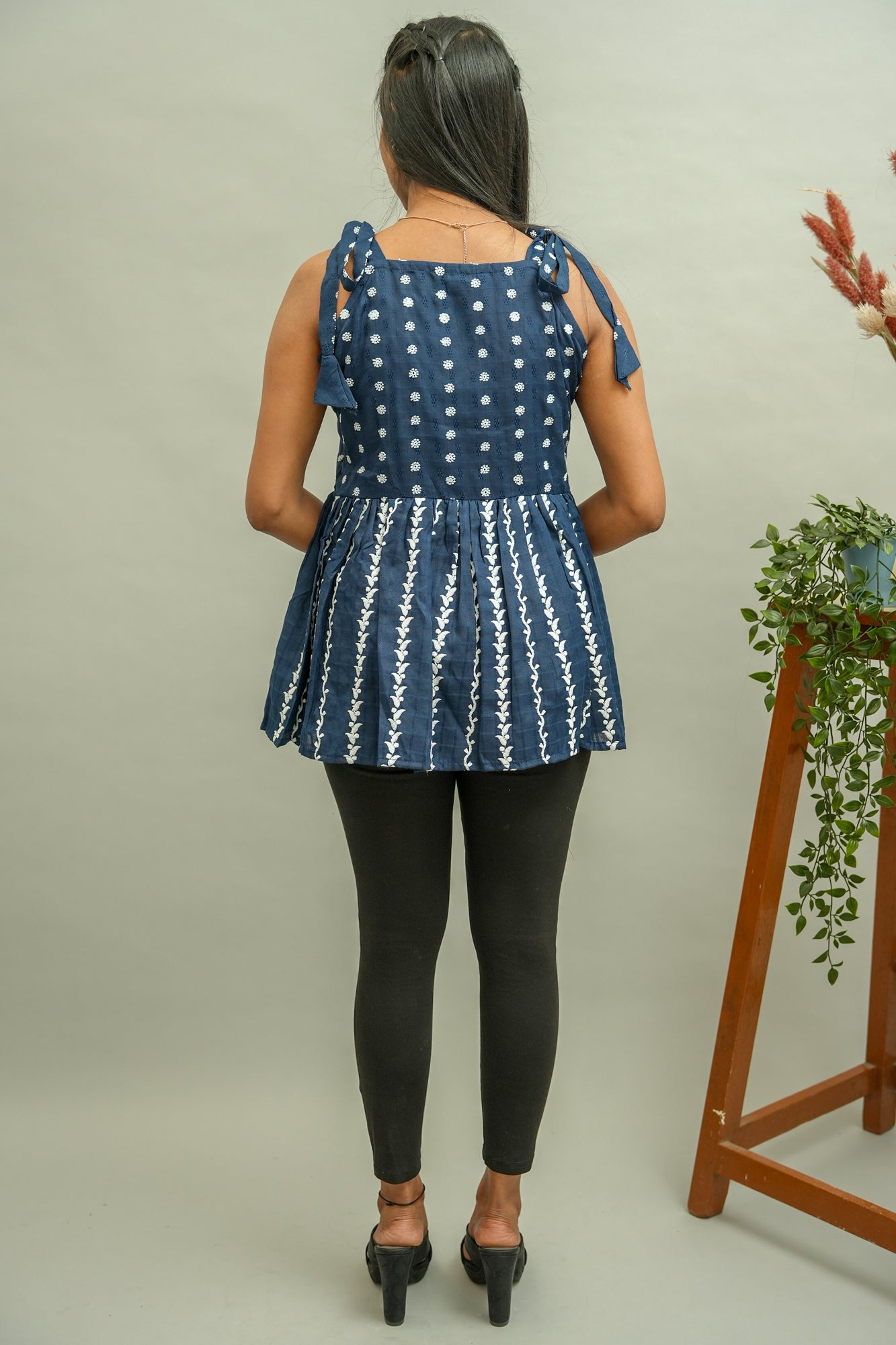 Description: Add a little bit of chick drama in your casual wear. This peplum style top crafted out drak blue chikankari fabric has a modern style cut with straped square neckline and gathers around the whole waist.