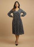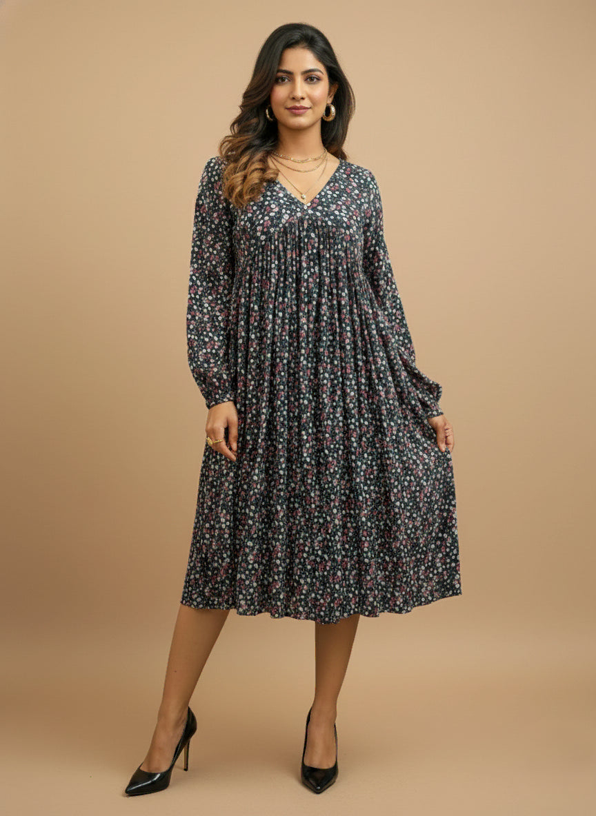 Description: A pretty dress in dark navy blue colour with multi coloured floral print on it is patterned out from a comfortable Cotton Blend fabric. It consists of a v neck with a different styled pattern on yoke. The yoke consists of gathers, it also has full sleeves with pleats on sleeve round and is below knee length.